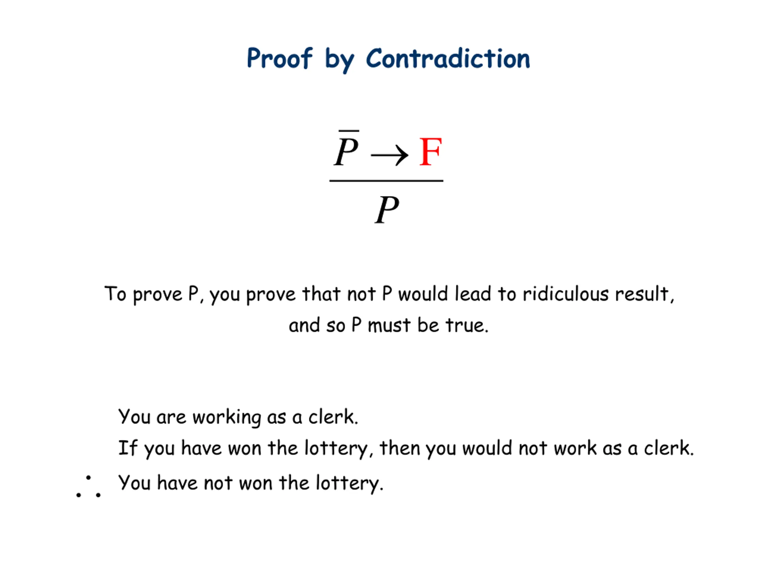 Proof by Contradiction F P P To prove P, you prove that not P would lead to ridiculous result, and so P must be true. You are working as a clerk. If you have won the lottery, then you would not work as a clerk. You have not won the lottery.