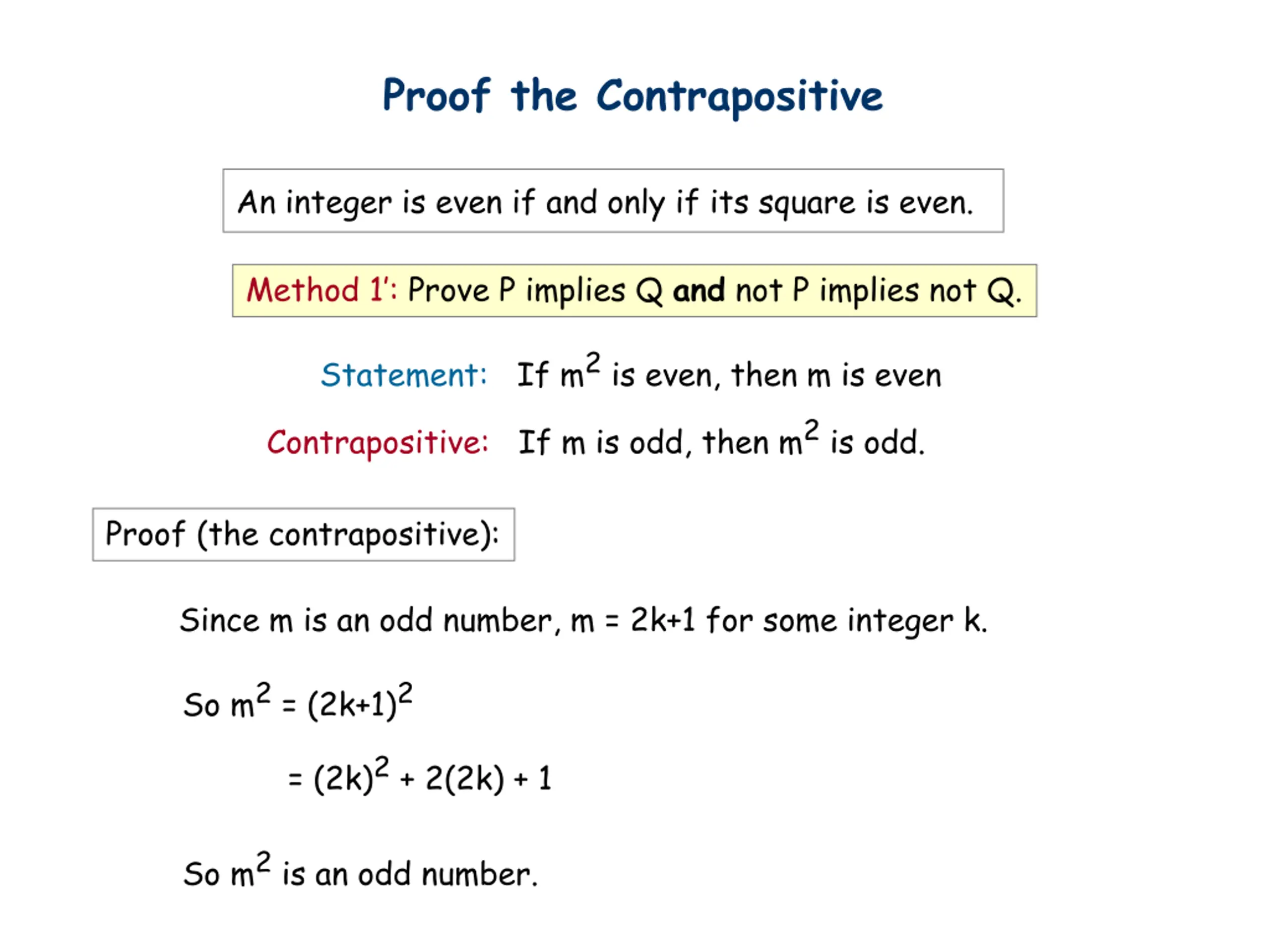 Proof the Contrapositive An integer is even if and only if its square is even. Method 1 : Prove P implies Q and not P implies not Q. Statement: If m2is even, then m is even Contrapositive: If m is odd, then m2is odd. Proof (the contrapositive): Since m is an odd number, m = 2k+1 for some integer k. So m2= (2k+1)2 = (2k)2+ 2(2k) + 1 So m2is an odd number.