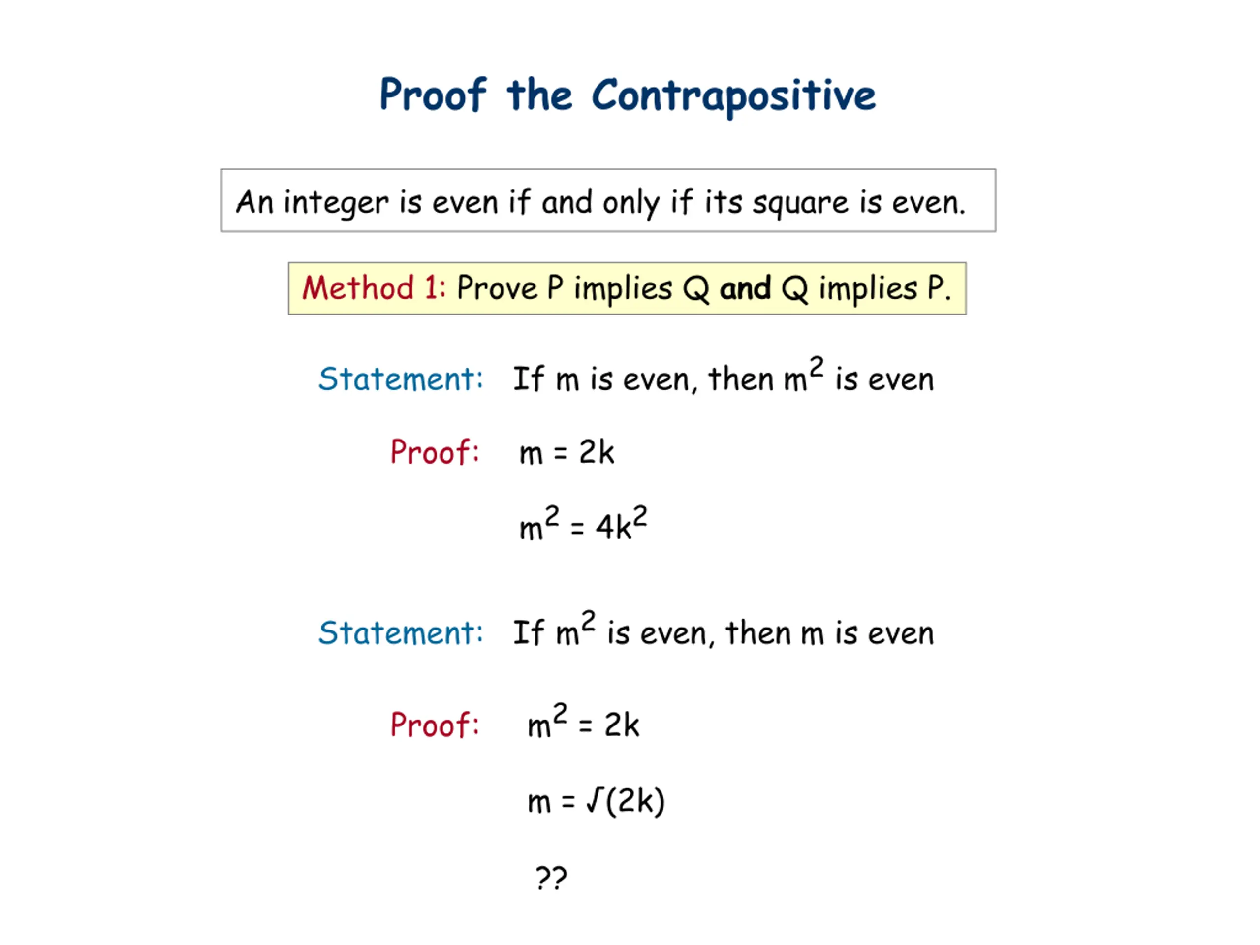 Proof the Contrapositive An integer is even if and only if its square is even. Method 1: Prove P implies Q and Q implies P. Statement: If m is even, then m2is even Proof: m = 2k m2= 4k2 Statement: If m2is even, then m is even m2= 2k Proof: m = (2k) ??