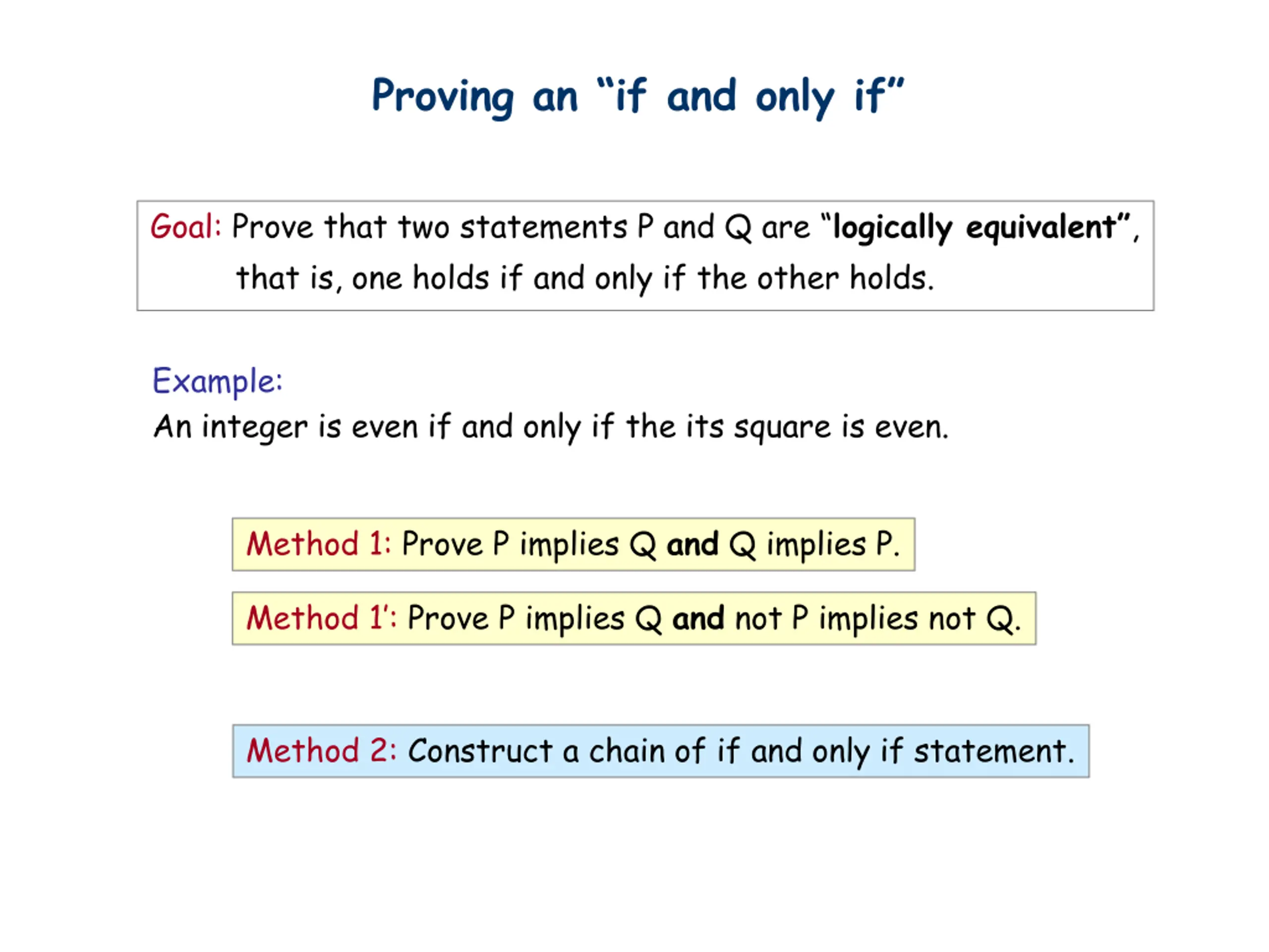 Proving an if and only if Goal: Prove that two statements P and Q are logically equivalent , that is, one holds if and only if the other holds. Example: An integer is even if and only if the its square is even. Method 1: Prove P implies Q and Q implies P. Method 1 : Prove P implies Q and not P implies not Q. Method 2: Construct a chain of if and only if statement.