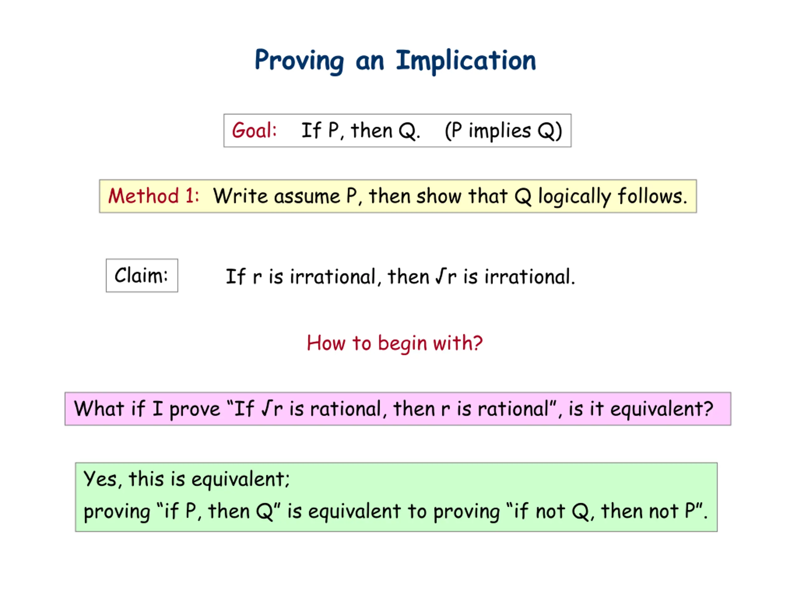 Proving an Implication Goal: If P, then Q. (P implies Q) Method 1: Write assume P, then show that Q logically follows. Claim: If r is irrational, then r is irrational. How to begin with? What if I prove If r is rational, then r is rational , is it equivalent? Yes, this is equivalent; proving if P, then Q is equivalent to proving if not Q, then not P .