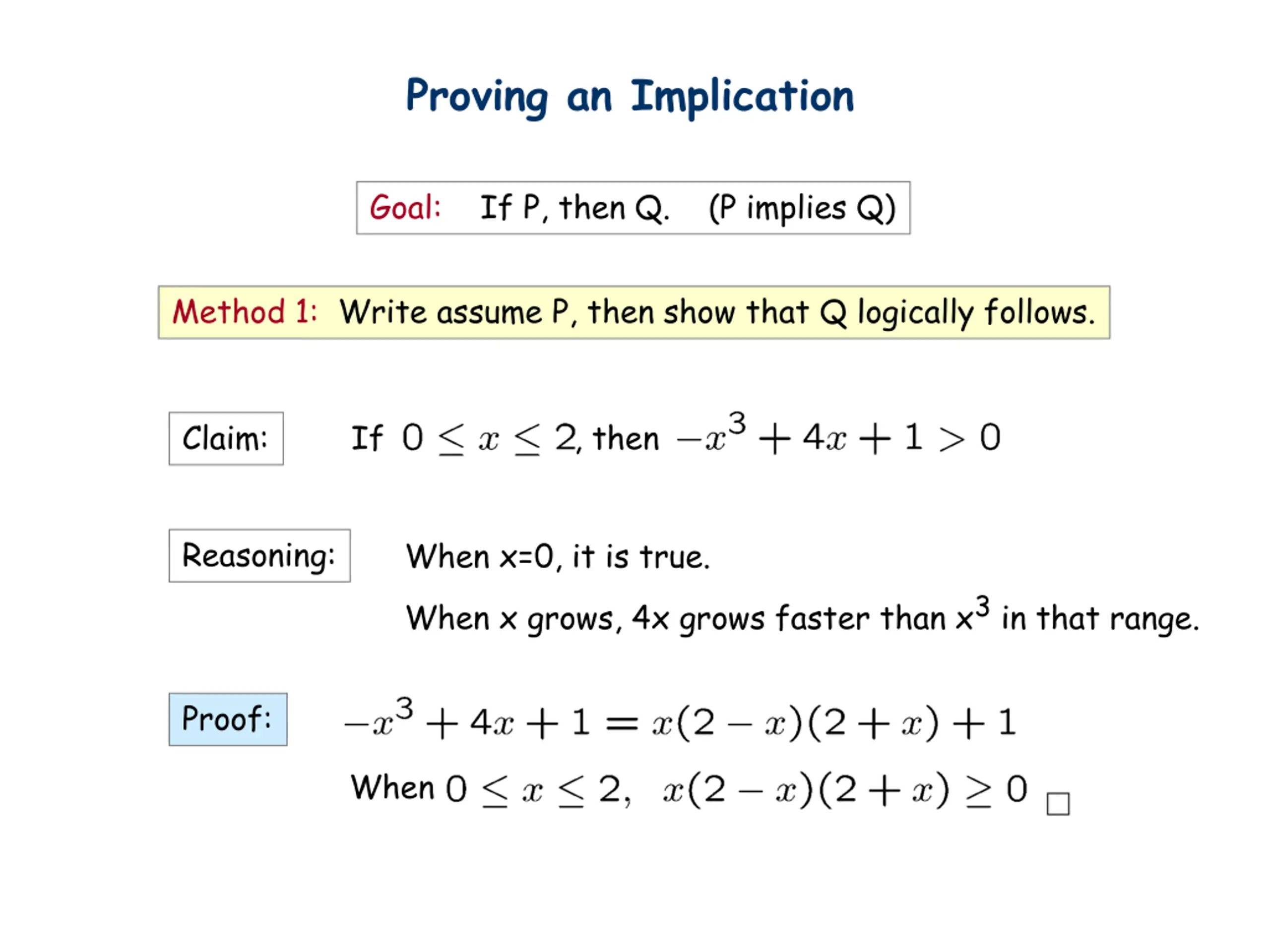 Proving an Implication Goal: If P, then Q. (P implies Q) Method 1: Write assume P, then show that Q logically follows. Claim: If , then Reasoning: When x=0, it is true. When x grows, 4x grows faster than x3in that range. Proof: When