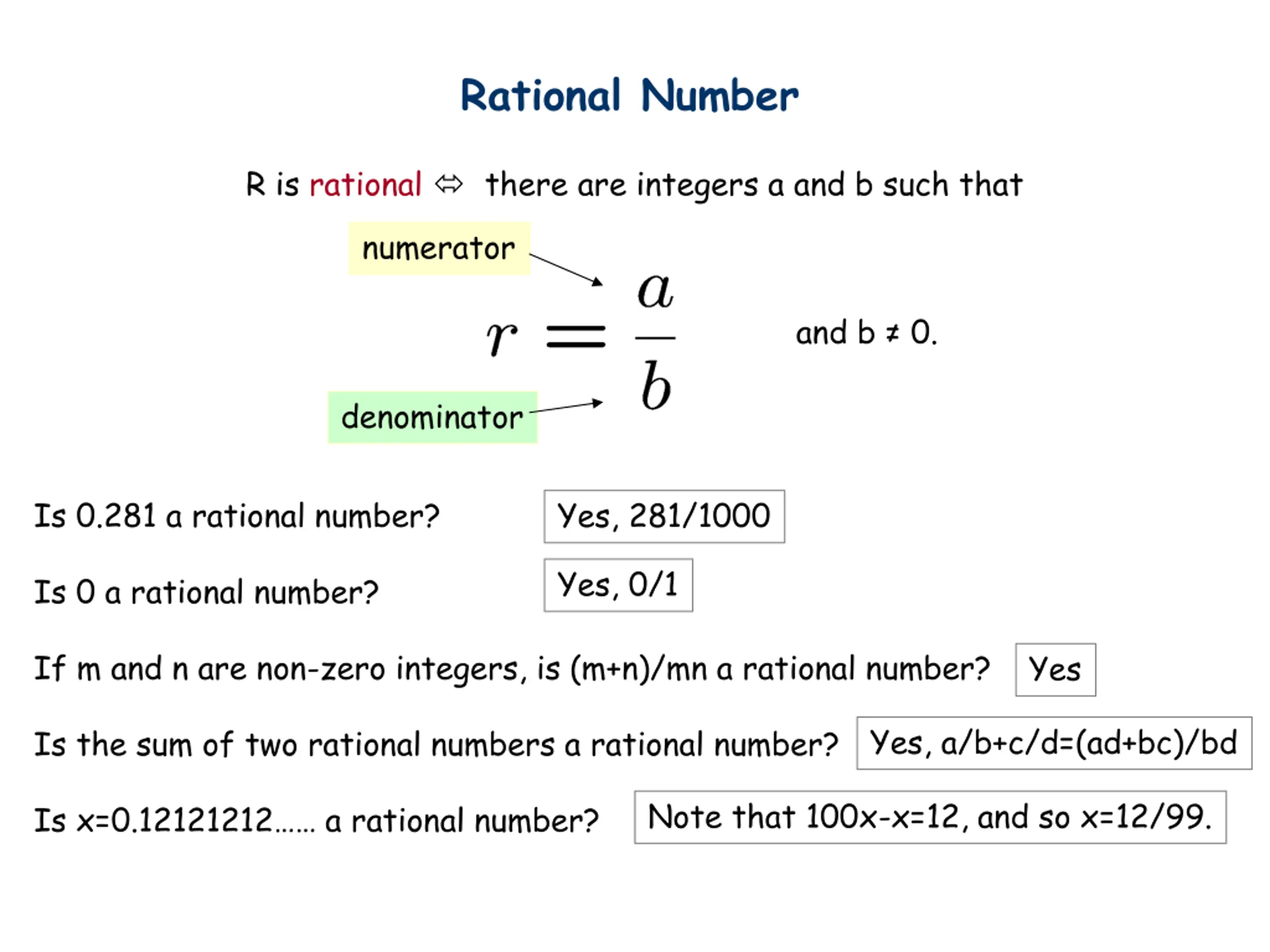 Rational Number R is rational there are integers a and b such that numerator and b 0. denominator Is 0.281 a rational number? Yes, 281/1000 Yes, 0/1 Is 0 a rational number? If m and n are non-zero integers, is (m+n)/mn a rational number? Yes Yes, a/b+c/d=(ad+bc)/bd Is the sum of two rational numbers a rational number? Note that 100x-x=12, and so x=12/99. Is x=0.12121212 a rational number?