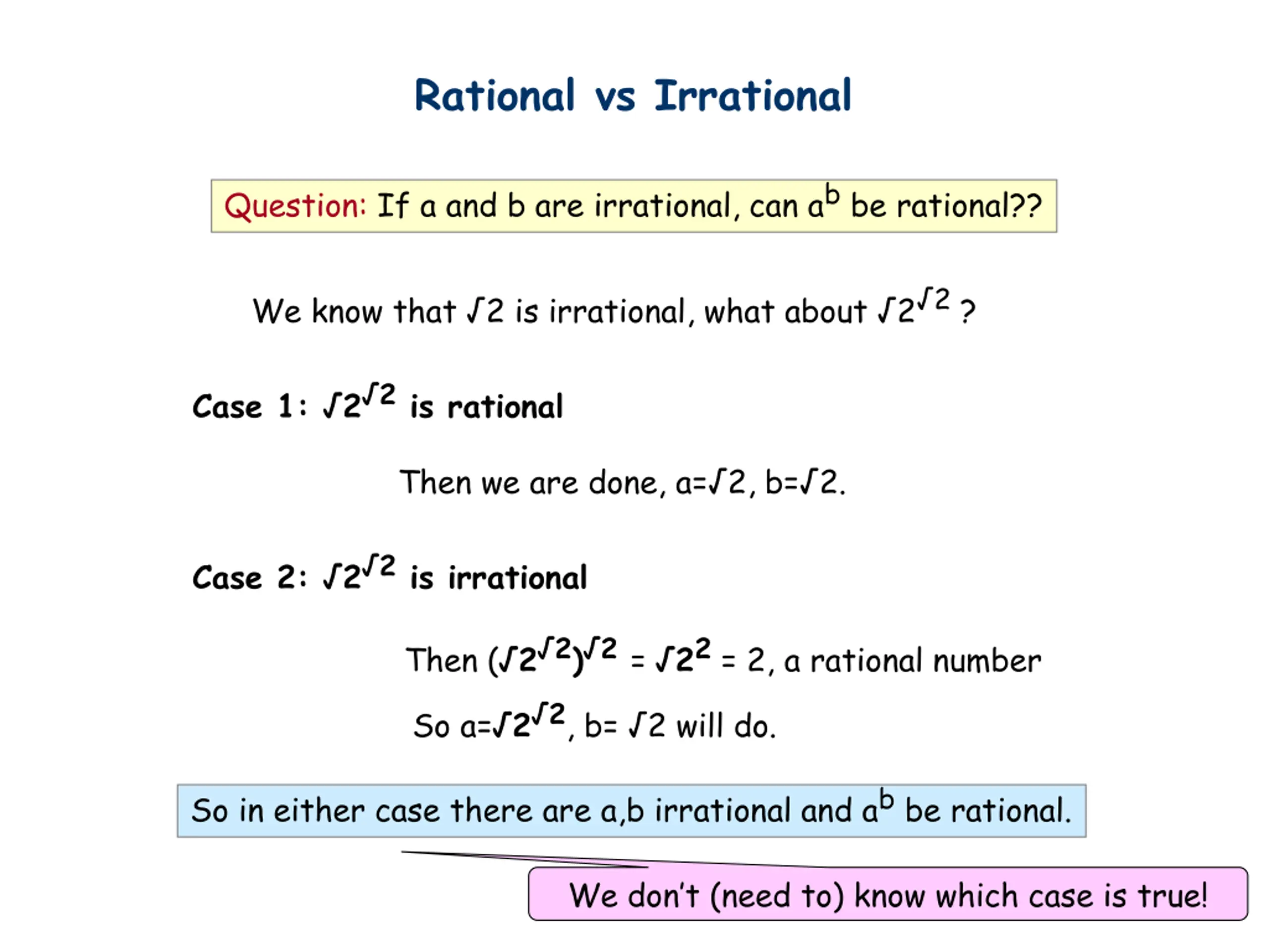 Rational vs Irrational Question: If a and b are irrational, can abbe rational?? We know that 2 is irrational, what about 2 2? Case 1: 2 2is rational Then we are done, a= 2, b= 2. Case 2: 2 2is irrational Then ( 2 2) 2 = 22= 2, a rational number So a= 2 2, b= 2 will do. So in either case there are a,b irrational and abbe rational. We don t (need to) know which case is true!
