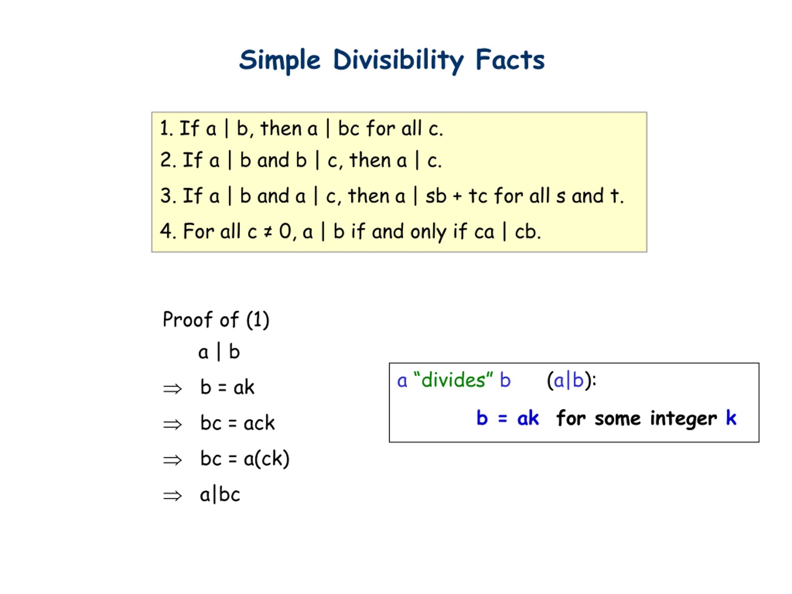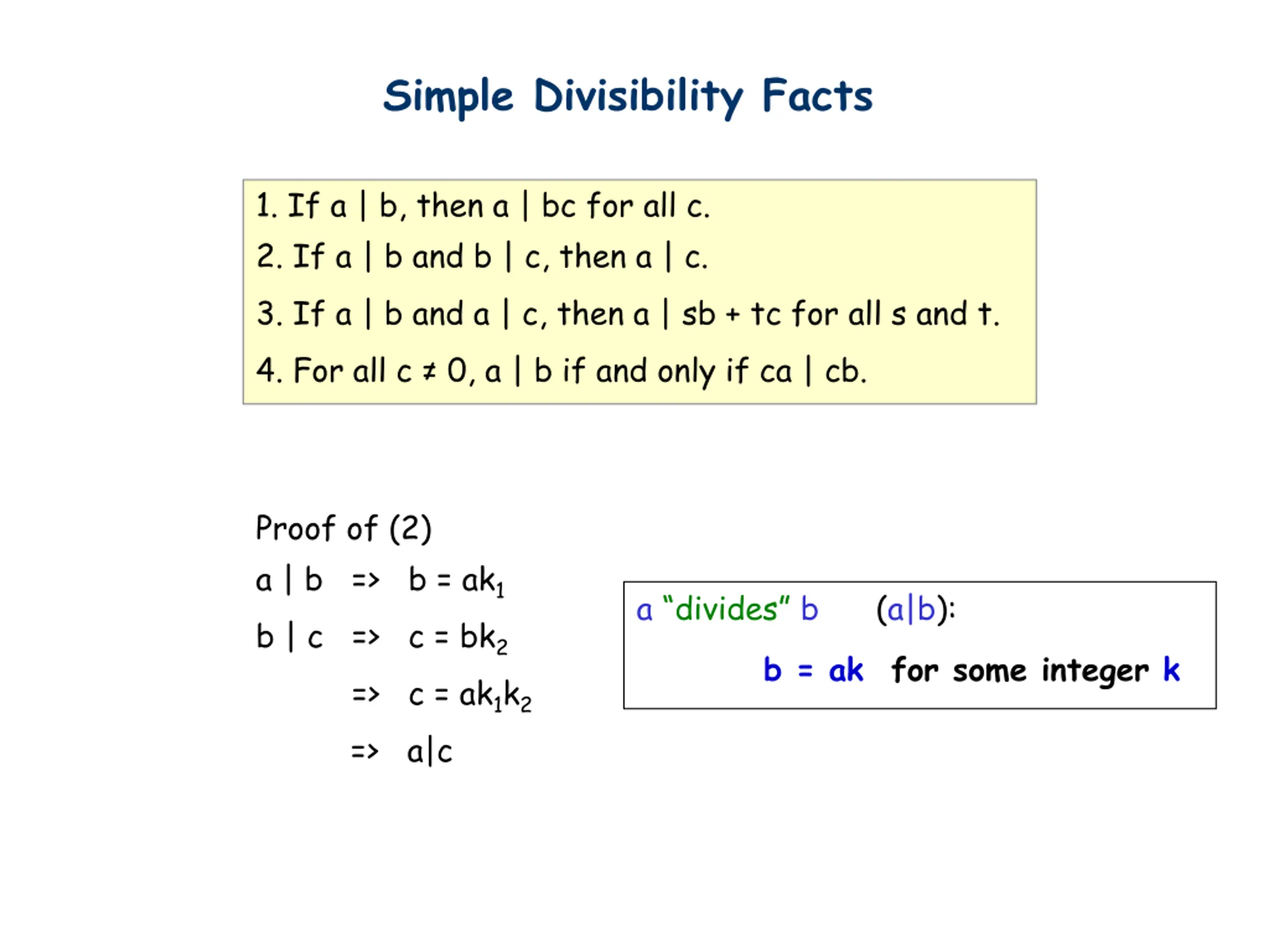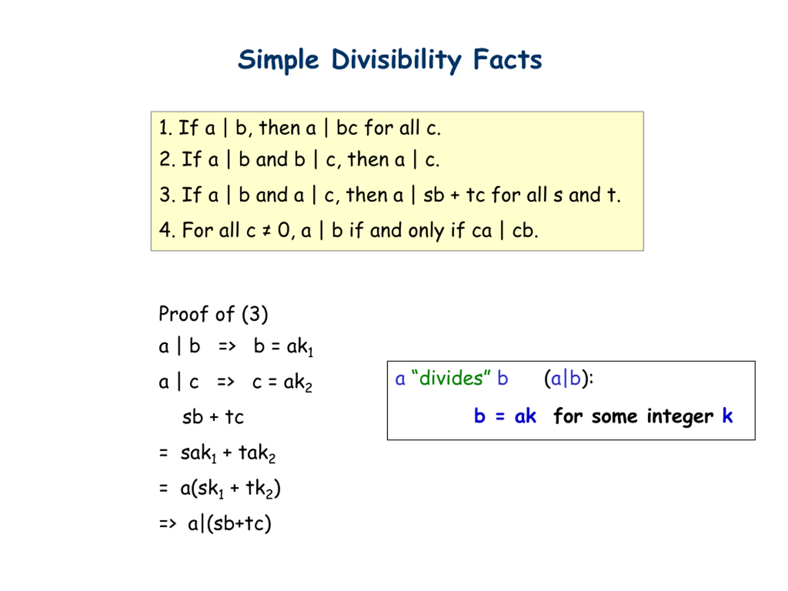 Simple Divisibility Facts 1. If a | b, then a | bc for all c. 2. If a | b and b | c, then a | c. 3. If a | b and a | c, then a | sb + tc for all s and t. 4. For all c 0, a | b if and only if ca | cb. Proof of (2) a | b => b = ak1 b | c => c = bk2 => c = ak1k2 => a|c a divides b (a|b): b = ak for some integer k
