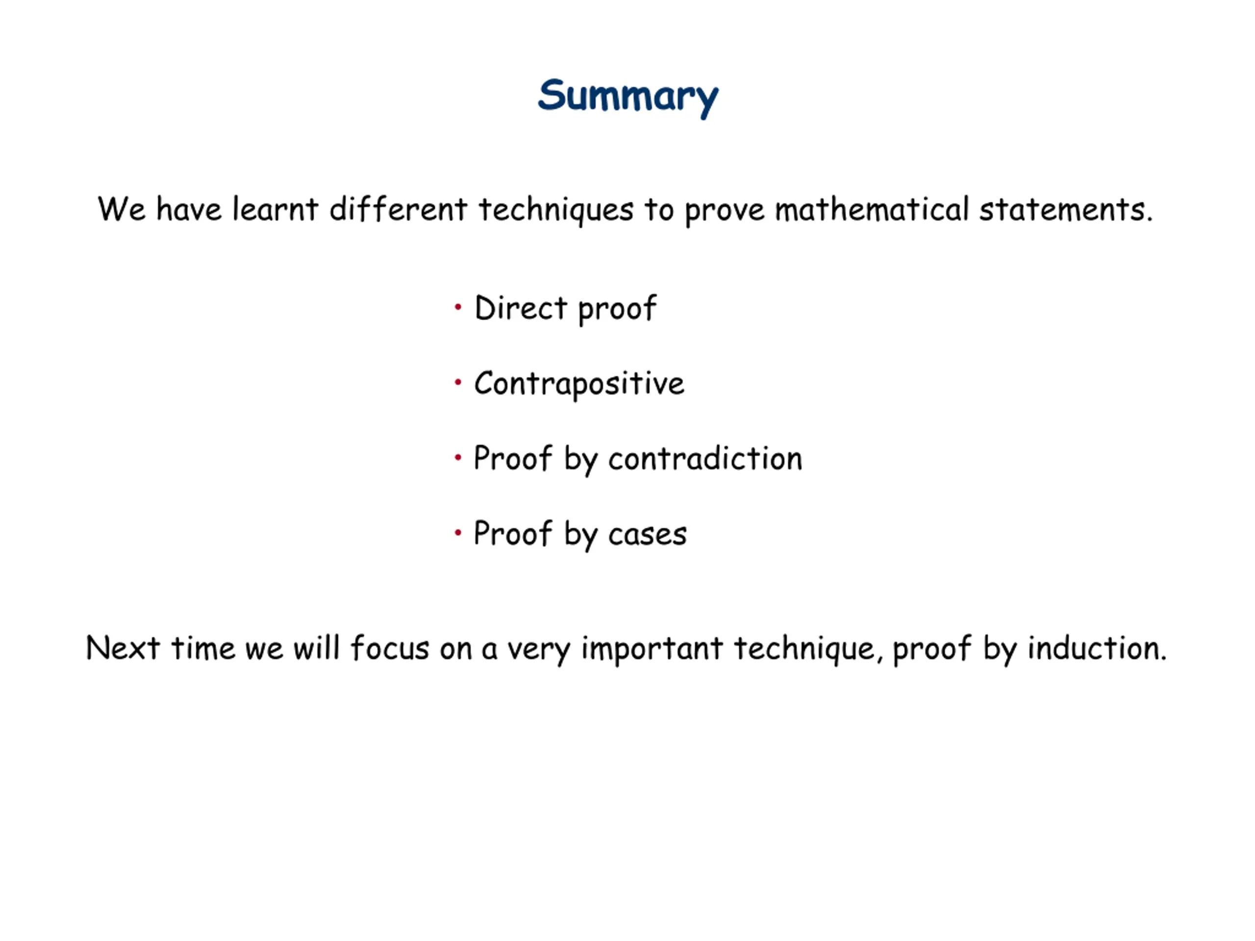 Summary We have learnt different techniques to prove mathematical statements. Direct proof Contrapositive Proof by contradiction Proof by cases Next time we will focus on a very important technique, proof by induction.