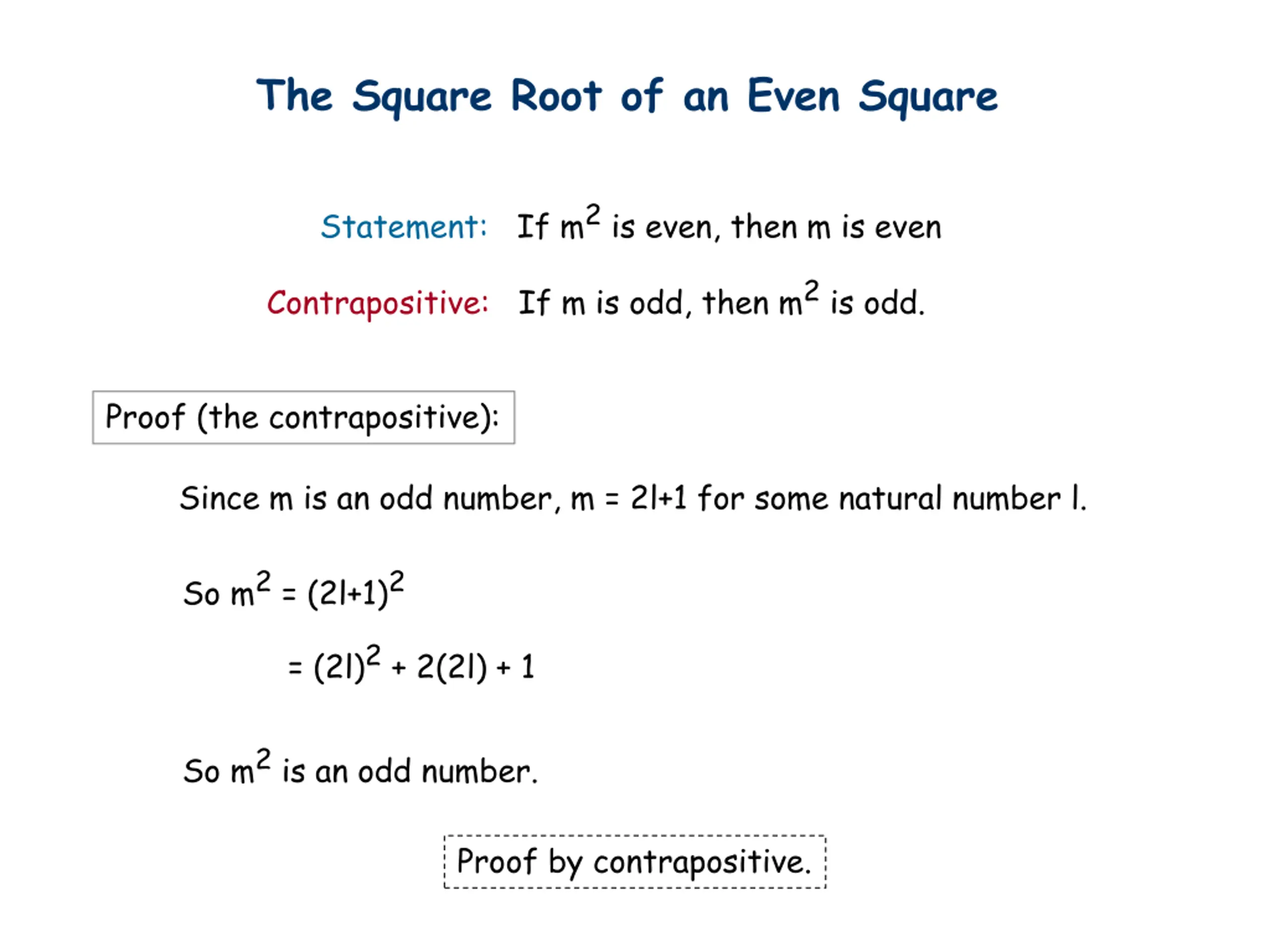 The Square Root of an Even Square Statement: If m2is even, then m is even Contrapositive: If m is odd, then m2is odd. Proof (the contrapositive): Since m is an odd number, m = 2l+1 for some natural number l. So m2= (2l+1)2 = (2l)2+ 2(2l) + 1 So m2is an odd number. Proof by contrapositive.