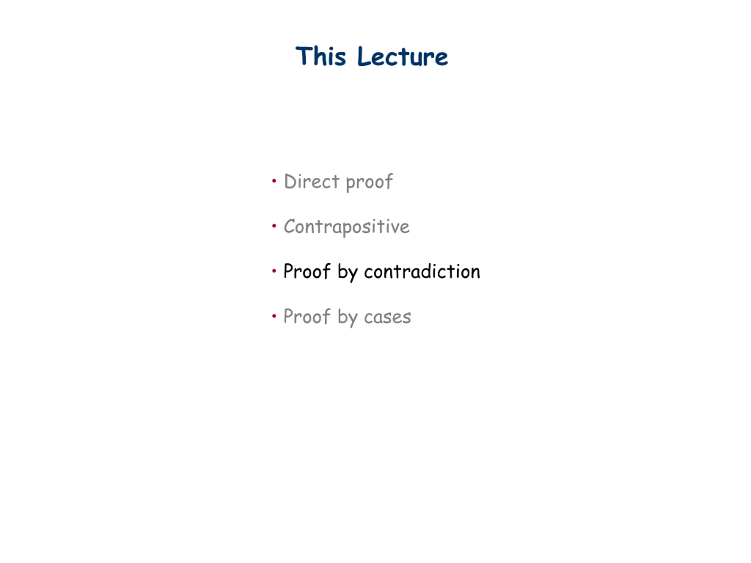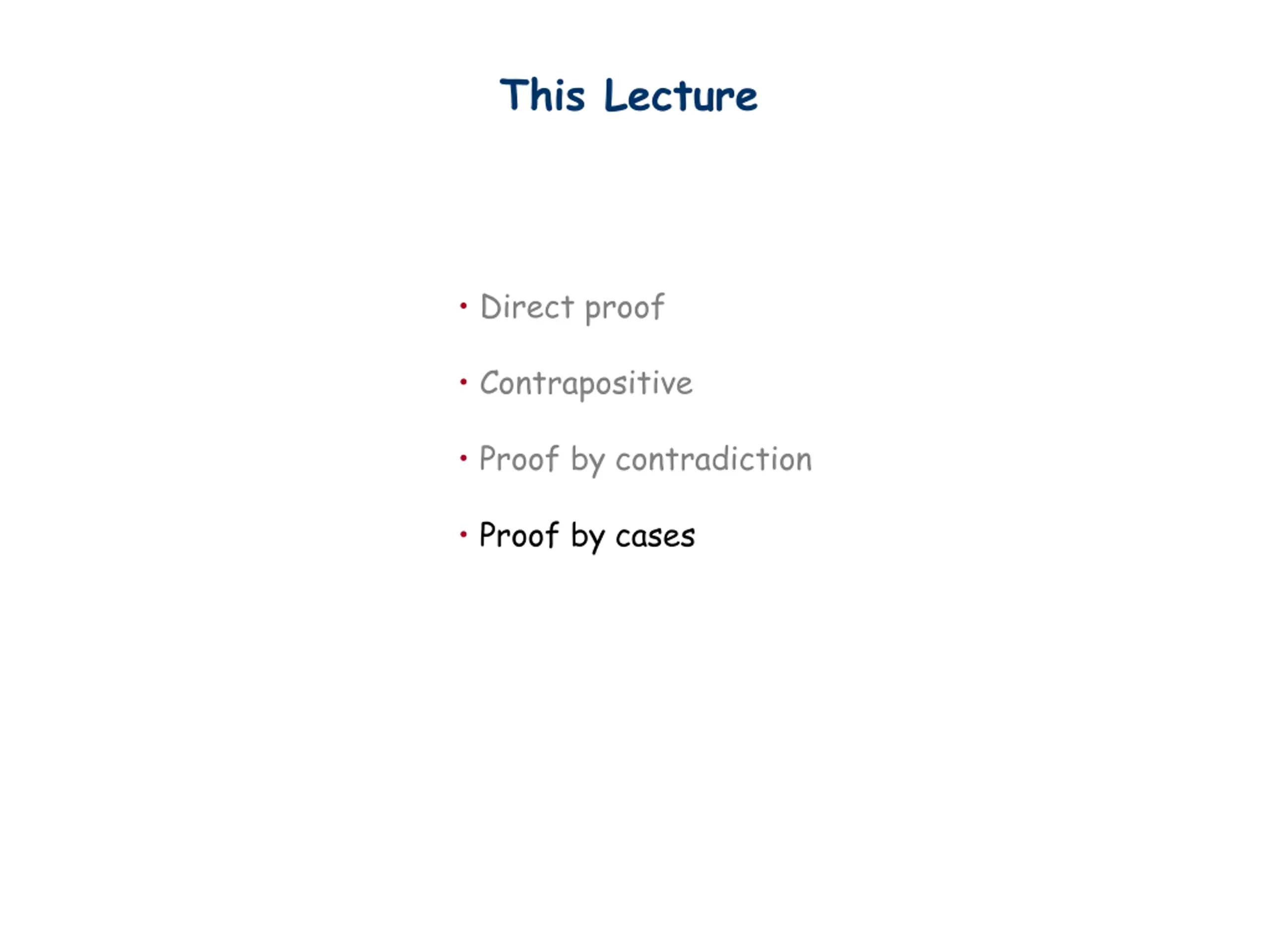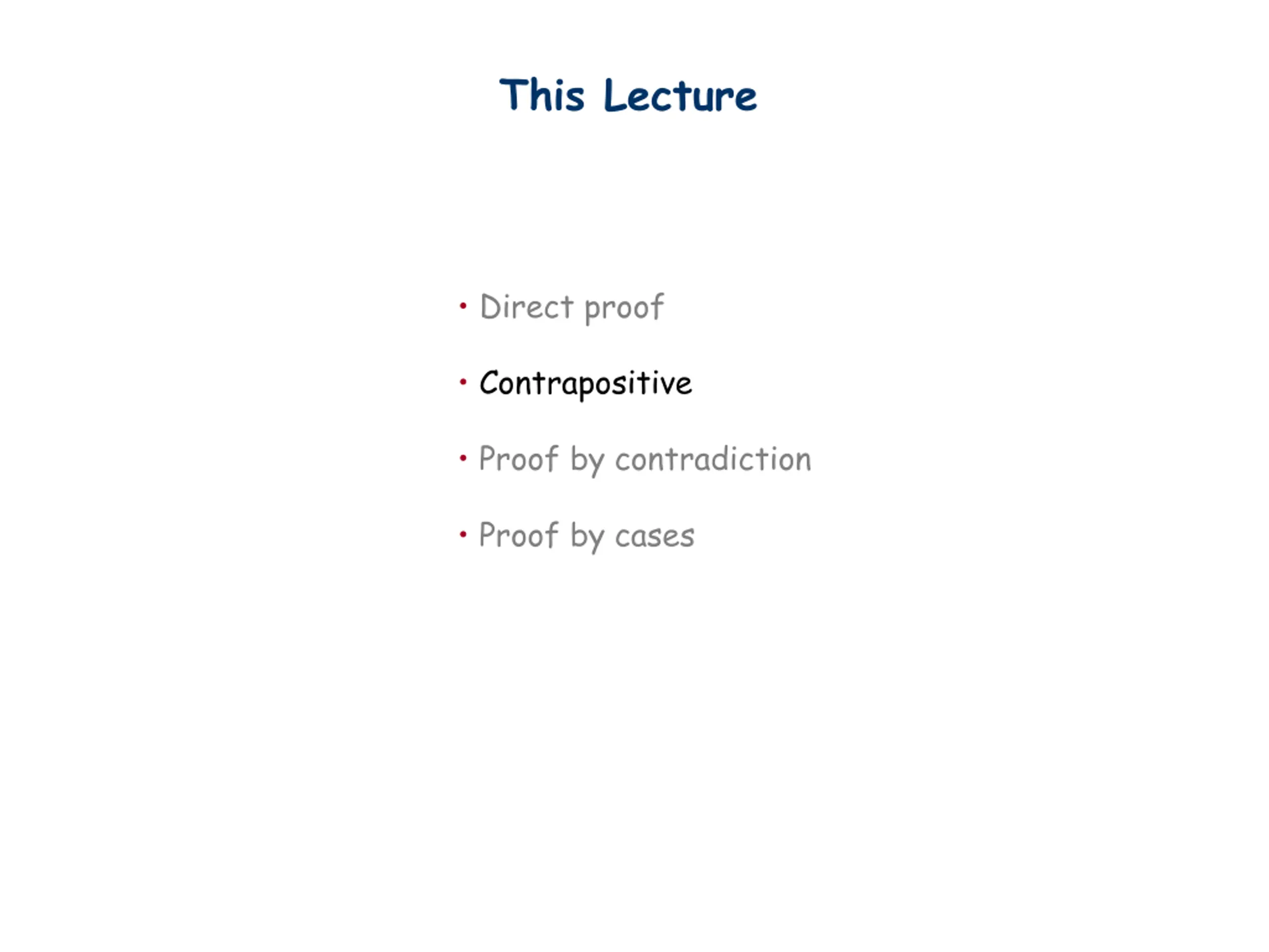 This Lecture Direct proof Contrapositive Proof by contradiction Proof by cases