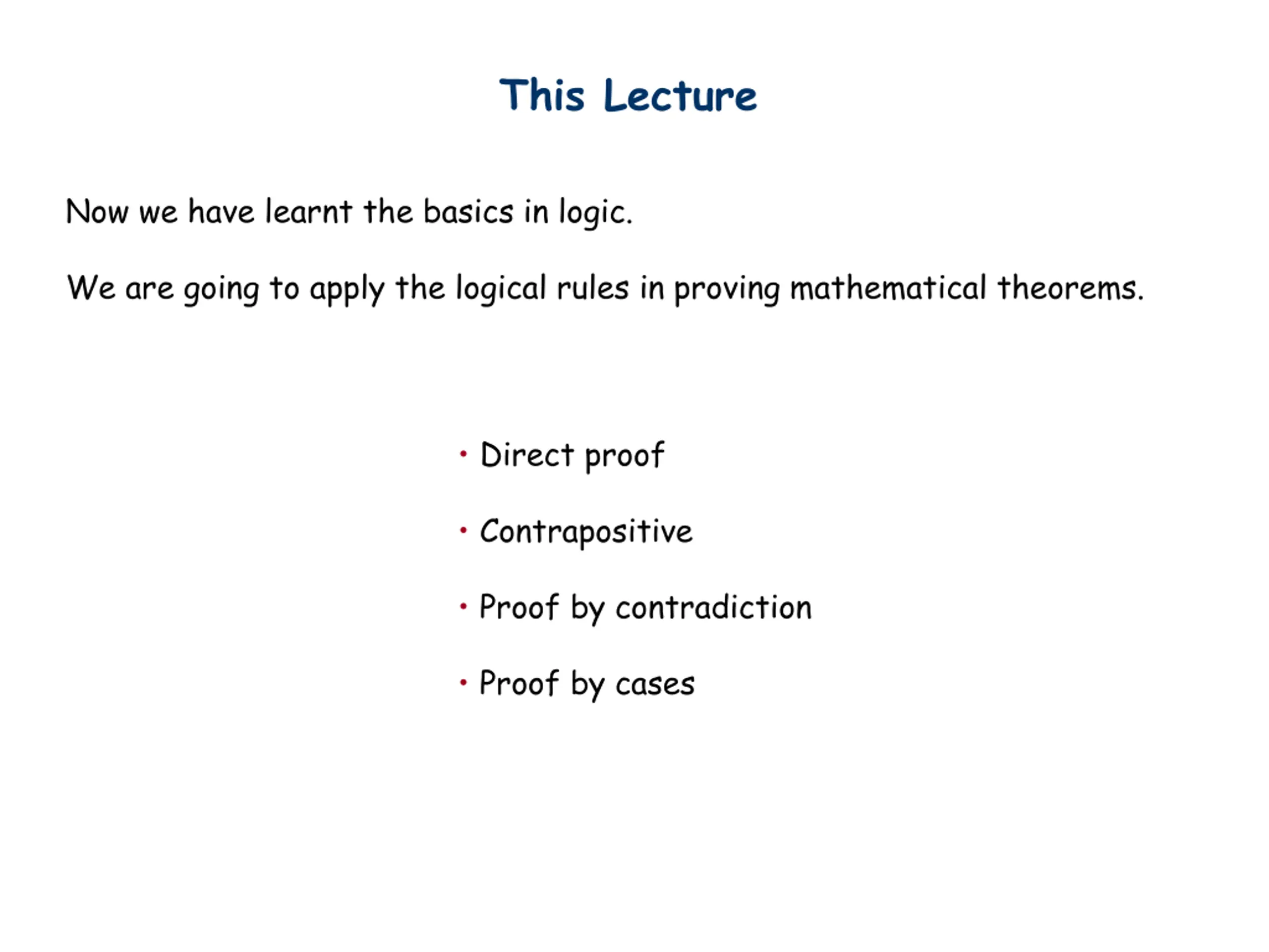 This Lecture Now we have learnt the basics in logic. We are going to apply the logical rules in proving mathematical theorems. Direct proof Contrapositive Proof by contradiction Proof by cases