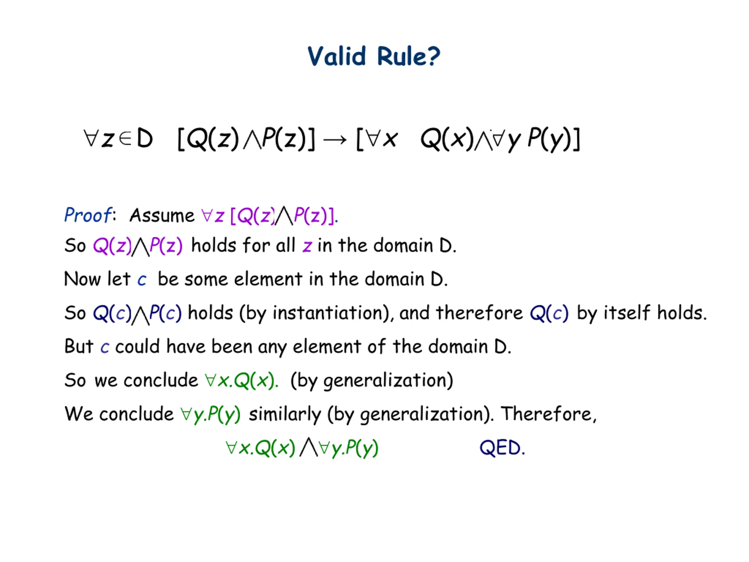 Valid Rule? z D [Q(z) P(z)] [ x Q(x) y P(y)] Proof: Assume z [Q(z) P(z)]. So Q(z) P(z) holds for all z in the domain D. Now let c be some element in the domain D. So Q(c) P(c) holds (by instantiation), and therefore Q(c) by itself holds. But c could have been any element of the domain D. So we conclude x.Q(x). (by generalization) We conclude y.P(y) similarly (by generalization). Therefore, x.Q(x) y.P(y) QED.