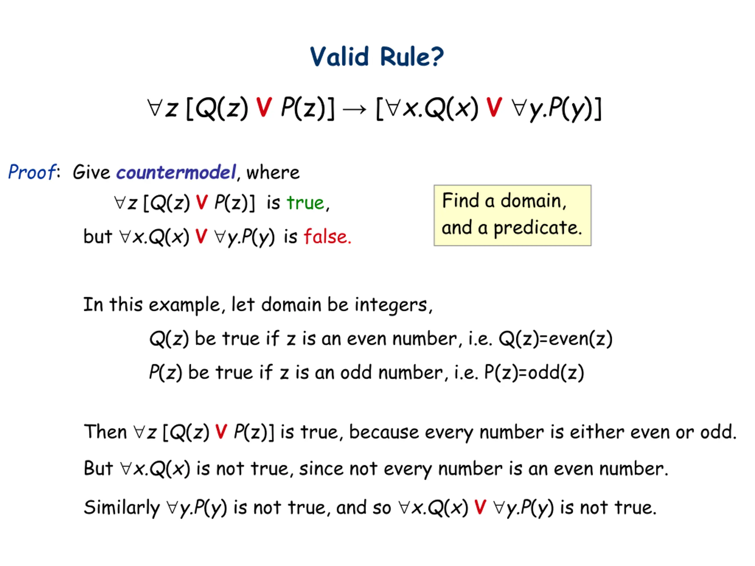 Valid Rule? z [Q(z) V P(z)] [ x.Q(x) V y.P(y)] Proof: Give countermodel, where z [Q(z) V P(z)] is true, but x.Q(x) V y.P(y) is false. Find a domain, and a predicate. In this example, let domain be integers, Q(z) be true if z is an even number, i.e. Q(z)=even(z) P(z) be true if z is an odd number, i.e. P(z)=odd(z) Then z [Q(z) V P(z)] is true, because every number is either even or odd. But x.Q(x) is not true, since not every number is an even number. Similarly y.P(y) is not true, and so x.Q(x) V y.P(y) is not true.