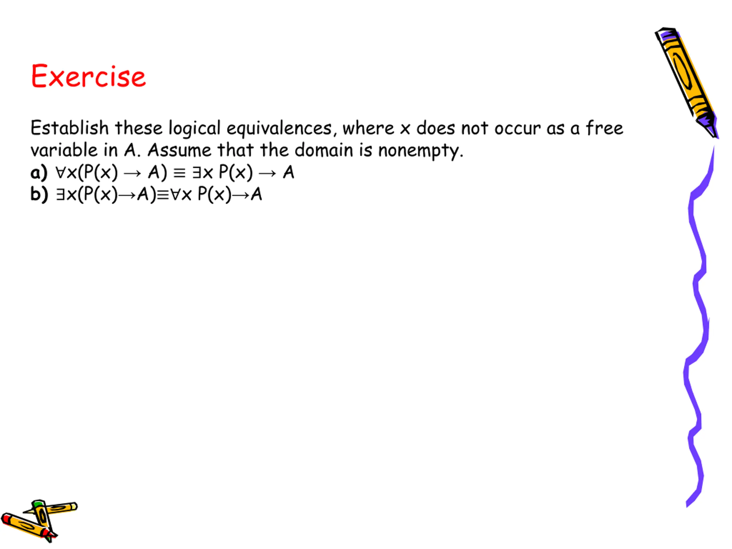 Exercise Establish these logical equivalences, where x does not occur as a free variable in A. Assume that the domain is nonempty. a) x(P(x) A) x P(x) A b) x(P(x) A) x P(x) A