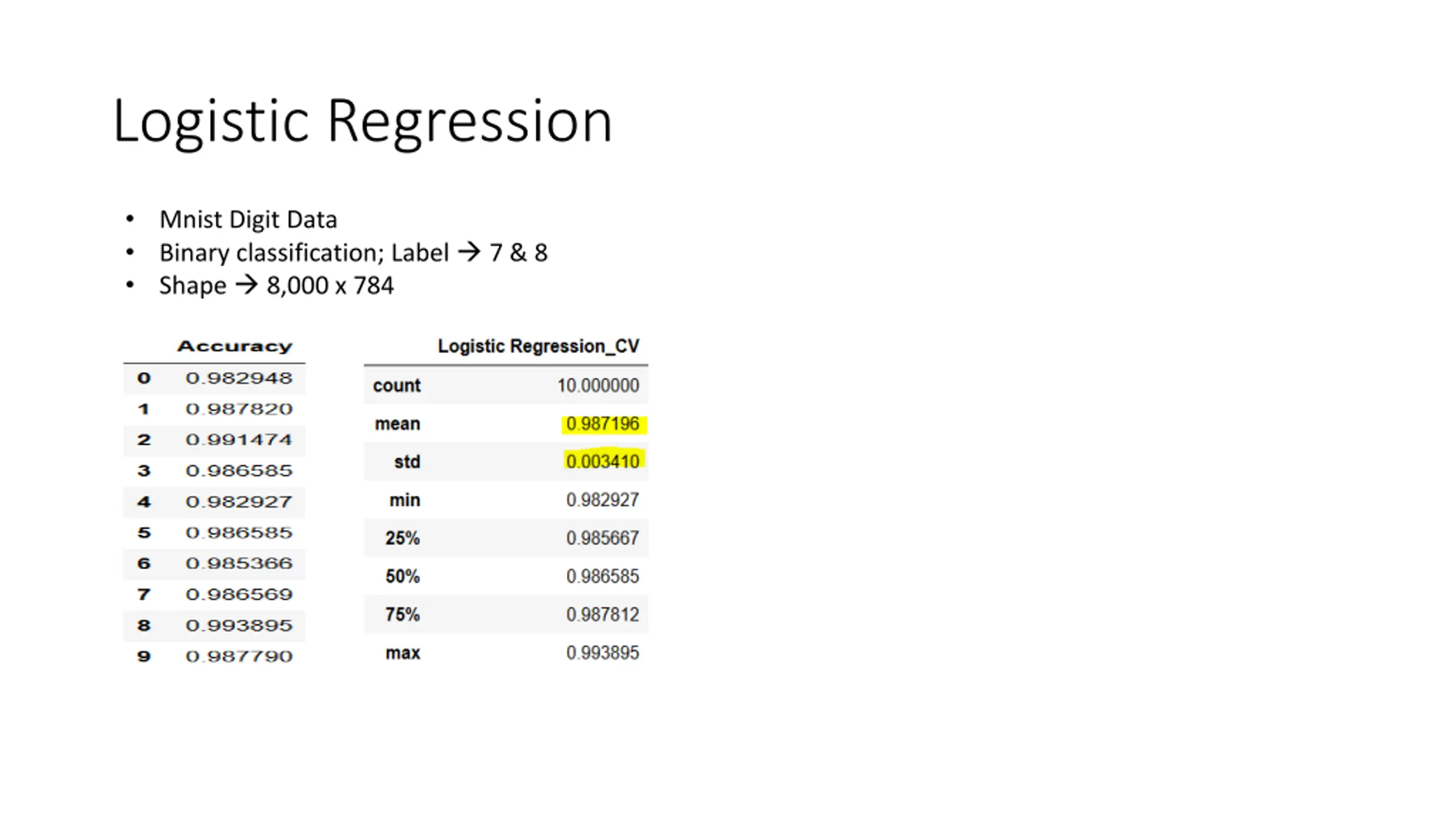 Logistic Regression Mnist Digit Data Binary classification; Label 7 & 8 Shape 8,000 x 784