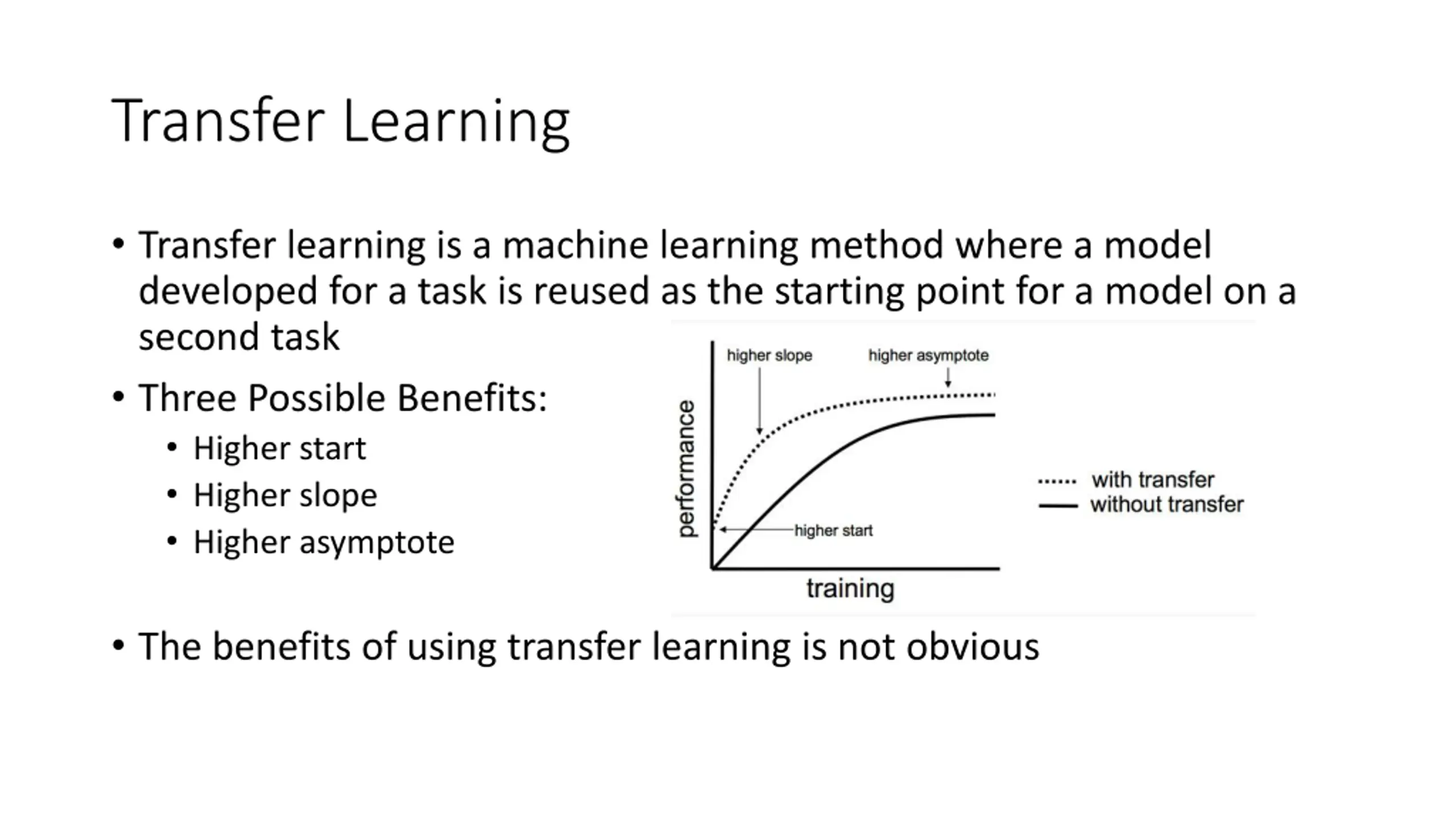 Transfer Learning Transfer learning is a machine learning method where a model developed for a task is reused as the starting point for a model on a second task Three Possible Benefits: Higher start Higher slope Higher asymptote The benefits of using transfer learning is not obvious
