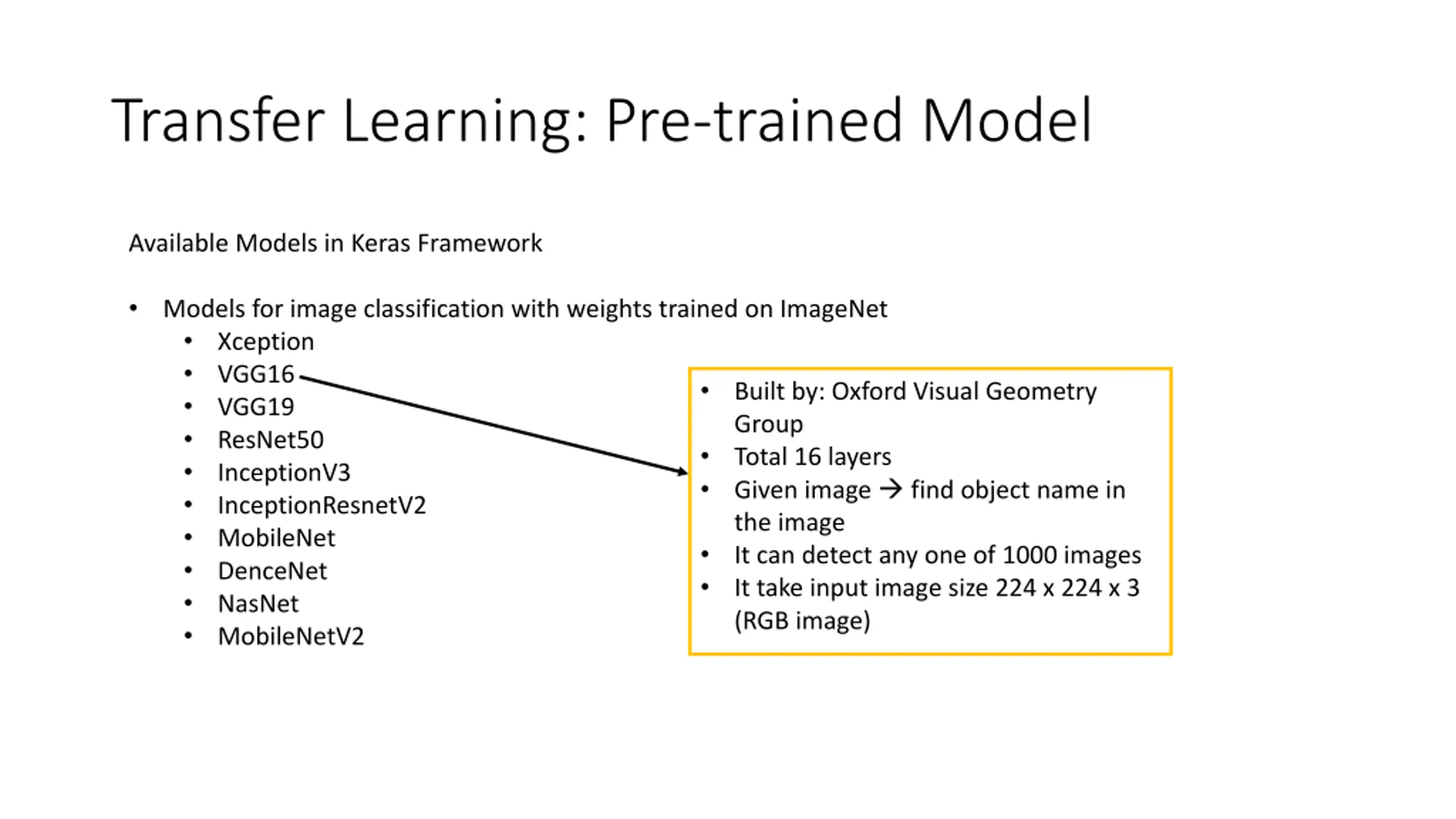 Transfer Learning: Pre-trained Model Available Models in Keras Framework Models for image classification with weights trained on ImageNet Xception VGG16 VGG19 ResNet50 InceptionV3 InceptionResnetV2 MobileNet DenceNet NasNet MobileNetV2 Built by: Oxford Visual Geometry Group Total 16 layers Given image find object name in the image It can detect any one of 1000 images It take input image size 224 x 224 x 3 (RGB image)