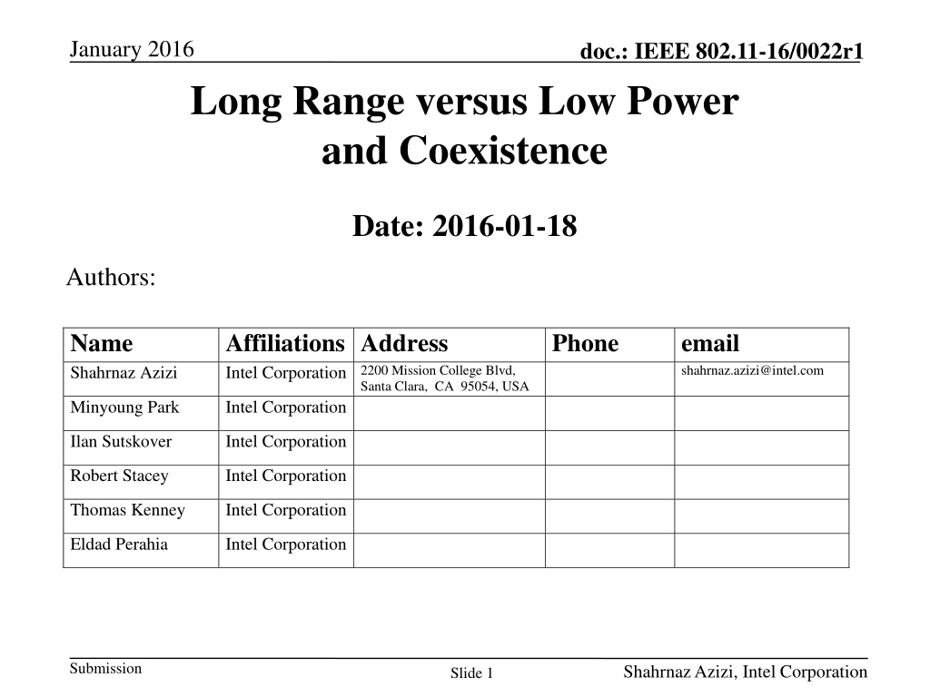 January 2016 doc.: IEEE 802.11-16/0022r1 Long Range versus Low Power and Coexistence Date: 2016-01-18 Authors: Name Shahrnaz Azizi Affiliations Address Intel Corporation 2200 Mission College Blvd, Santa Clara, CA 95054, USA Intel Corporation Phone email shahrnaz.azizi@intel.com Minyoung Park Ilan Sutskover Intel Corporation Robert Stacey Intel Corporation Thomas Kenney Intel Corporation Eldad Perahia Intel Corporation Submission Shahrnaz Azizi, Intel Corporation Slide 1