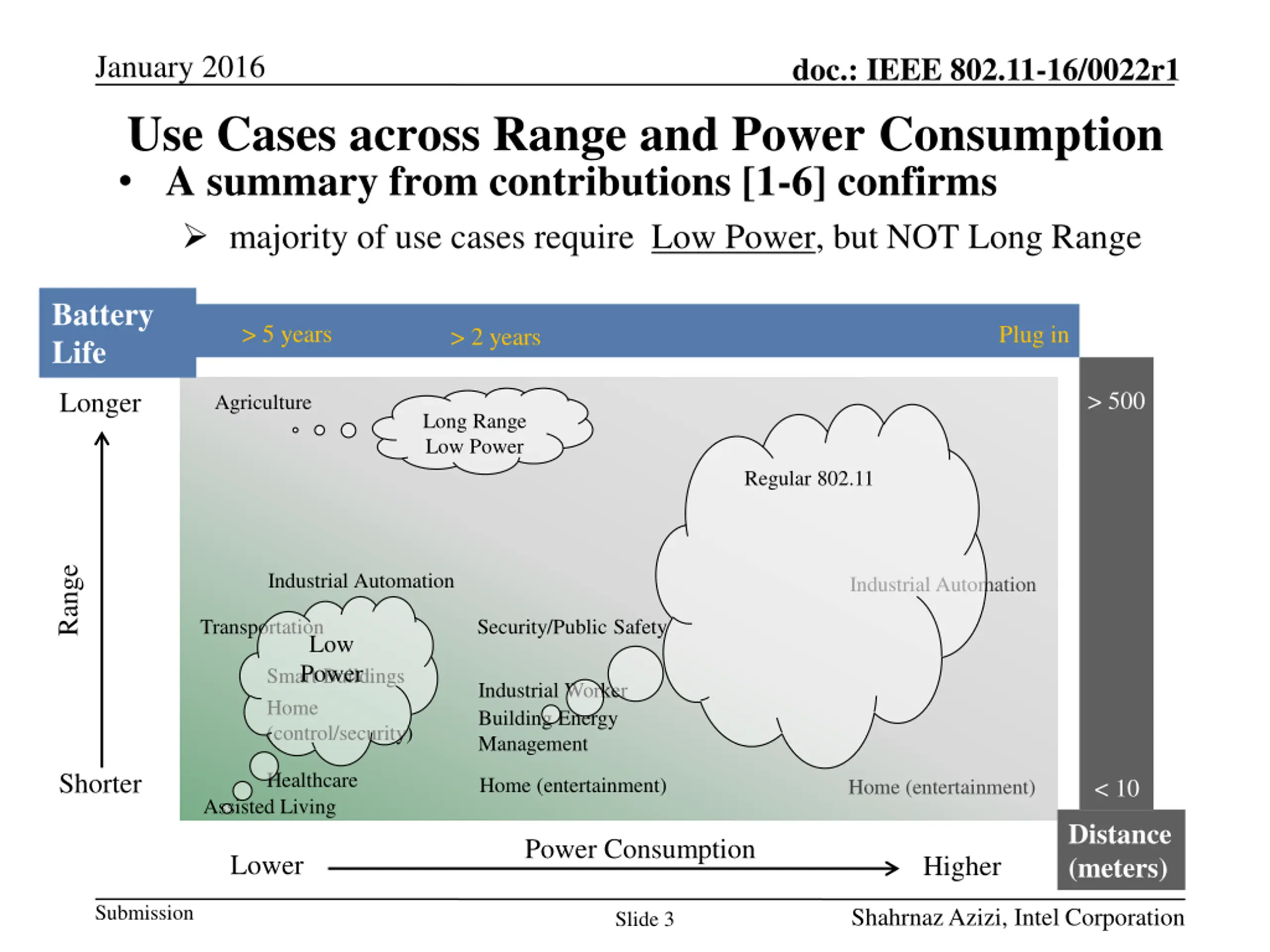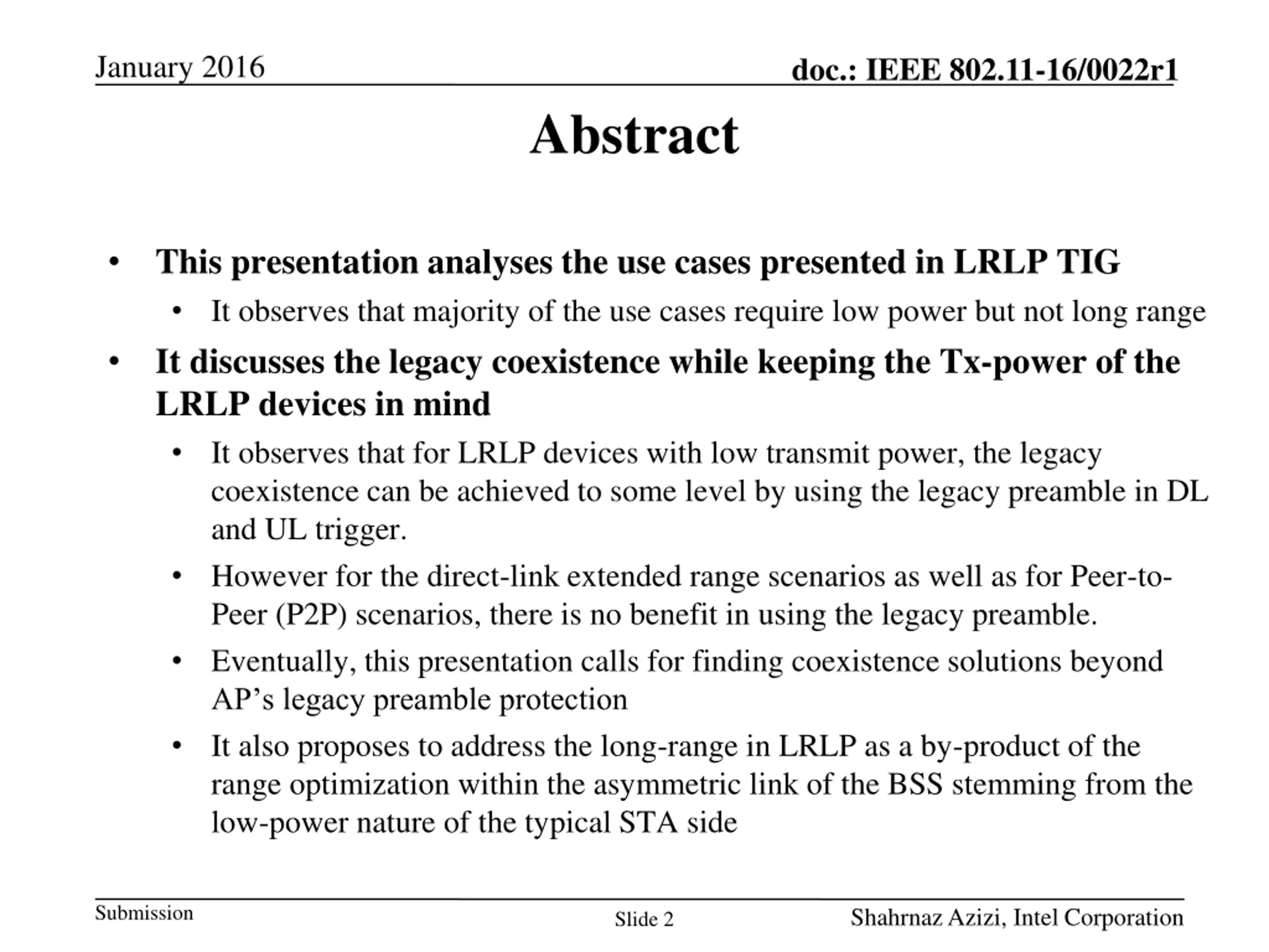 January 2016 doc.: IEEE 802.11-16/0022r1 Abstract This presentation analyses the use cases presented in LRLP TIG It observes that majority of the use cases require low power but not long range It discusses the legacy coexistence while keeping the Tx-power of the LRLP devices in mind It observes that for LRLP devices with low transmit power, the legacy coexistence can be achieved to some level by using the legacy preamble in DL and UL trigger. However for the direct-link extended range scenarios as well as for Peer-to- Peer (P2P) scenarios, there is no benefit in using the legacy preamble. Eventually, this presentation calls for finding coexistence solutions beyond AP s legacy preamble protection It also proposes to address the long-range in LRLP as a by-product of the range optimization within the asymmetric link of the BSS stemming from the low-power nature of the typical STA side Submission Shahrnaz Azizi, Intel Corporation Slide 2