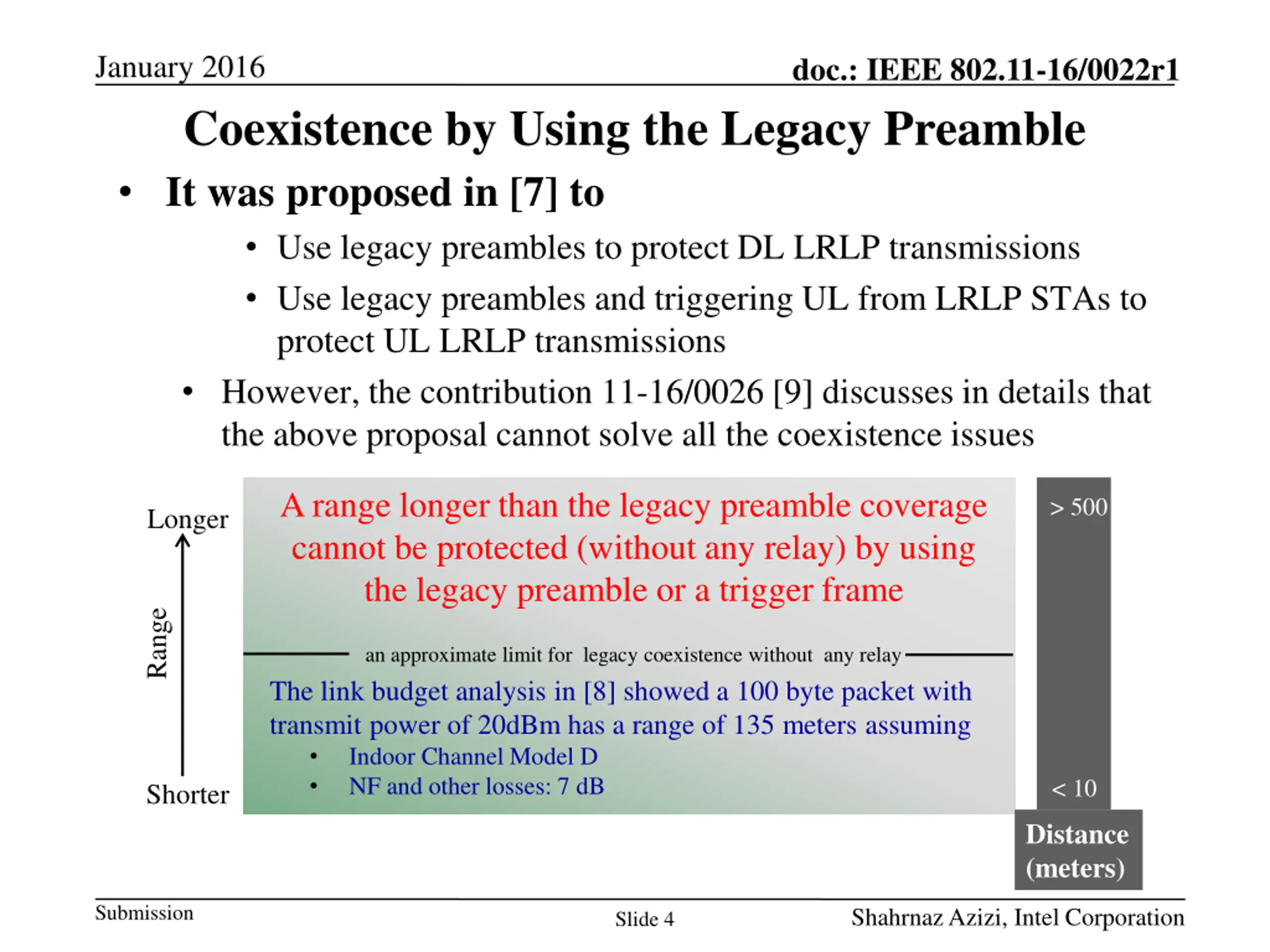 January 2016 doc.: IEEE 802.11-16/0022r1 Coexistence by Using the Legacy Preamble It was proposed in [7] to Use legacy preambles to protect DL LRLP transmissions Use legacy preambles and triggering UL from LRLP STAs to protect UL LRLP transmissions However, the contribution 11-16/0026 [9] discusses in details that the above proposal cannot solve all the coexistence issues A range longer than the legacy preamble coverage cannot be protected (without any relay) by using the legacy preamble or a trigger frame > 500 Longer > 500 Range an approximate limit for legacy coexistence without any relay The link budget analysis in [8] showed a 100 byte packet with transmit power of 20dBm has a range of 135 meters assuming Indoor Channel Model D NF and other losses: 7 dB < 10 Shorter Distance (meters) Submission Shahrnaz Azizi, Intel Corporation Slide 4