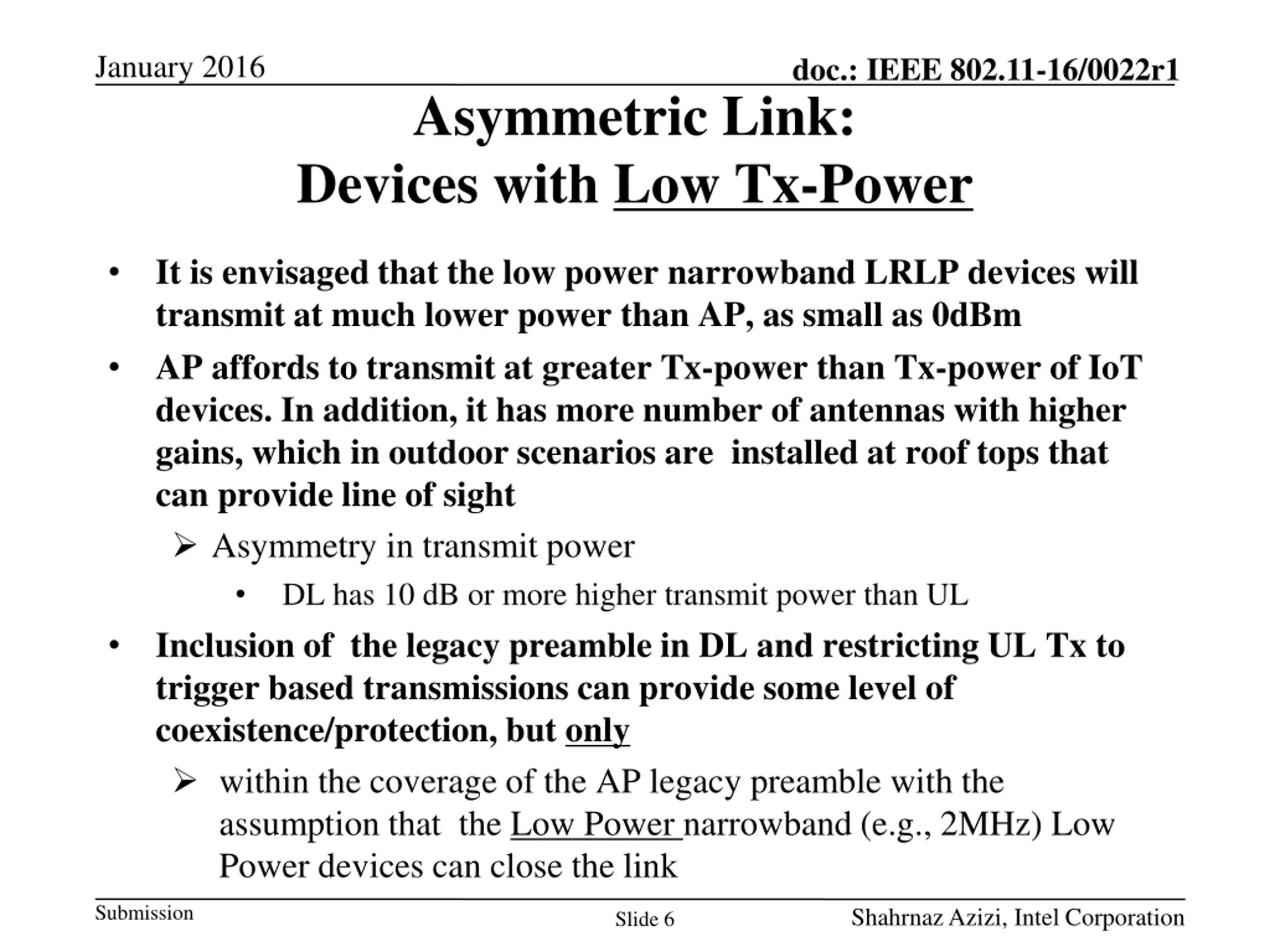 January 2016 doc.: IEEE 802.11-16/0022r1 Asymmetric Link: Devices with Low Tx-Power It is envisaged that the low power narrowband LRLP devices will transmit at much lower power than AP, as small as 0dBm AP affords to transmit at greater Tx-power than Tx-power of IoT devices. In addition, it has more number of antennas with higher gains, which in outdoor scenarios are installed at roof tops that can provide line of sight Asymmetry in transmit power DL has 10 dB or more higher transmit power than UL Inclusion of the legacy preamble in DL and restricting UL Tx to trigger based transmissions can provide some level of coexistence/protection, but only within the coverage of the AP legacy preamble with the assumption that the Low Power narrowband (e.g., 2MHz) Low Power devices can close the link Submission Shahrnaz Azizi, Intel Corporation Slide 6