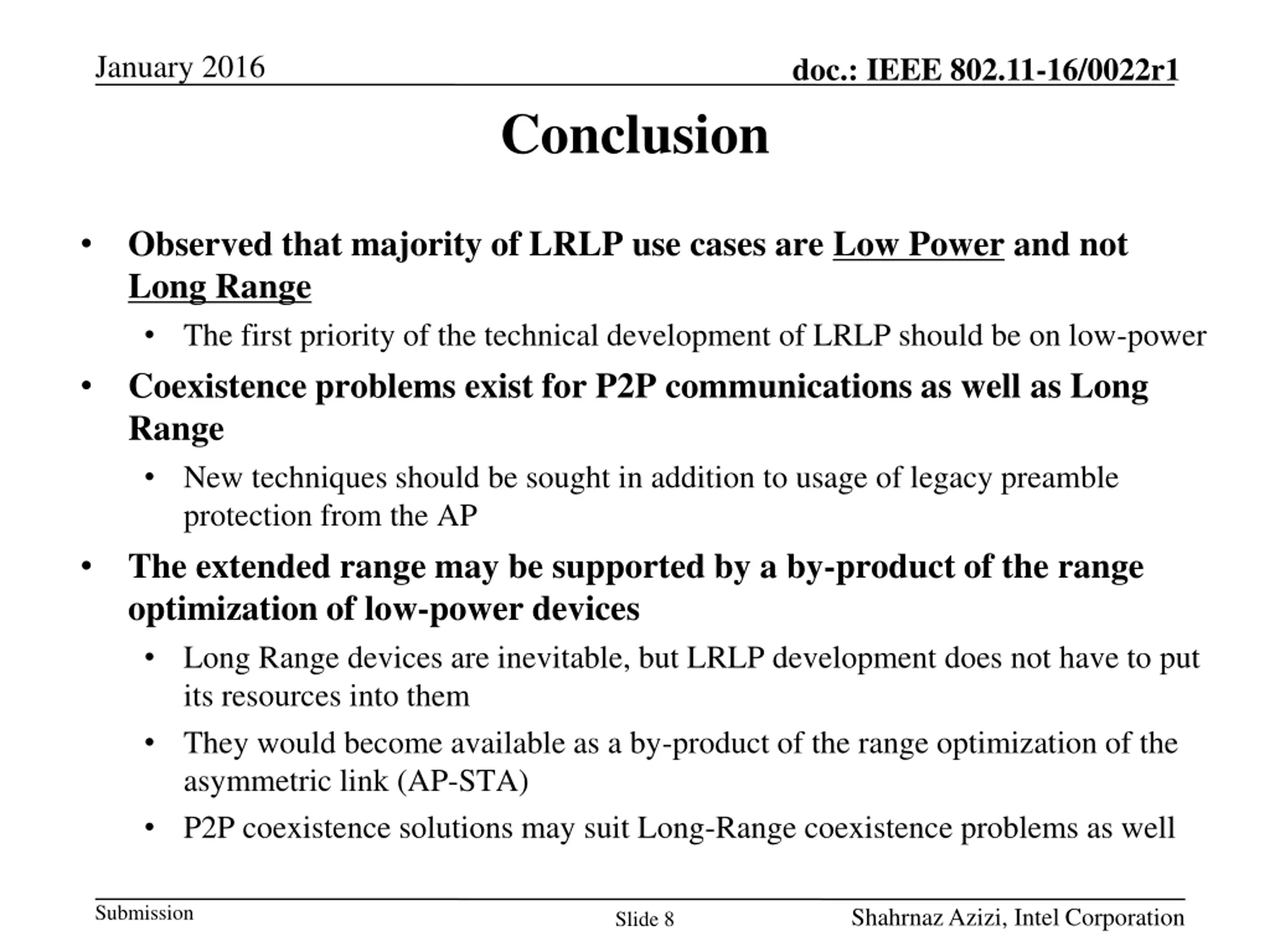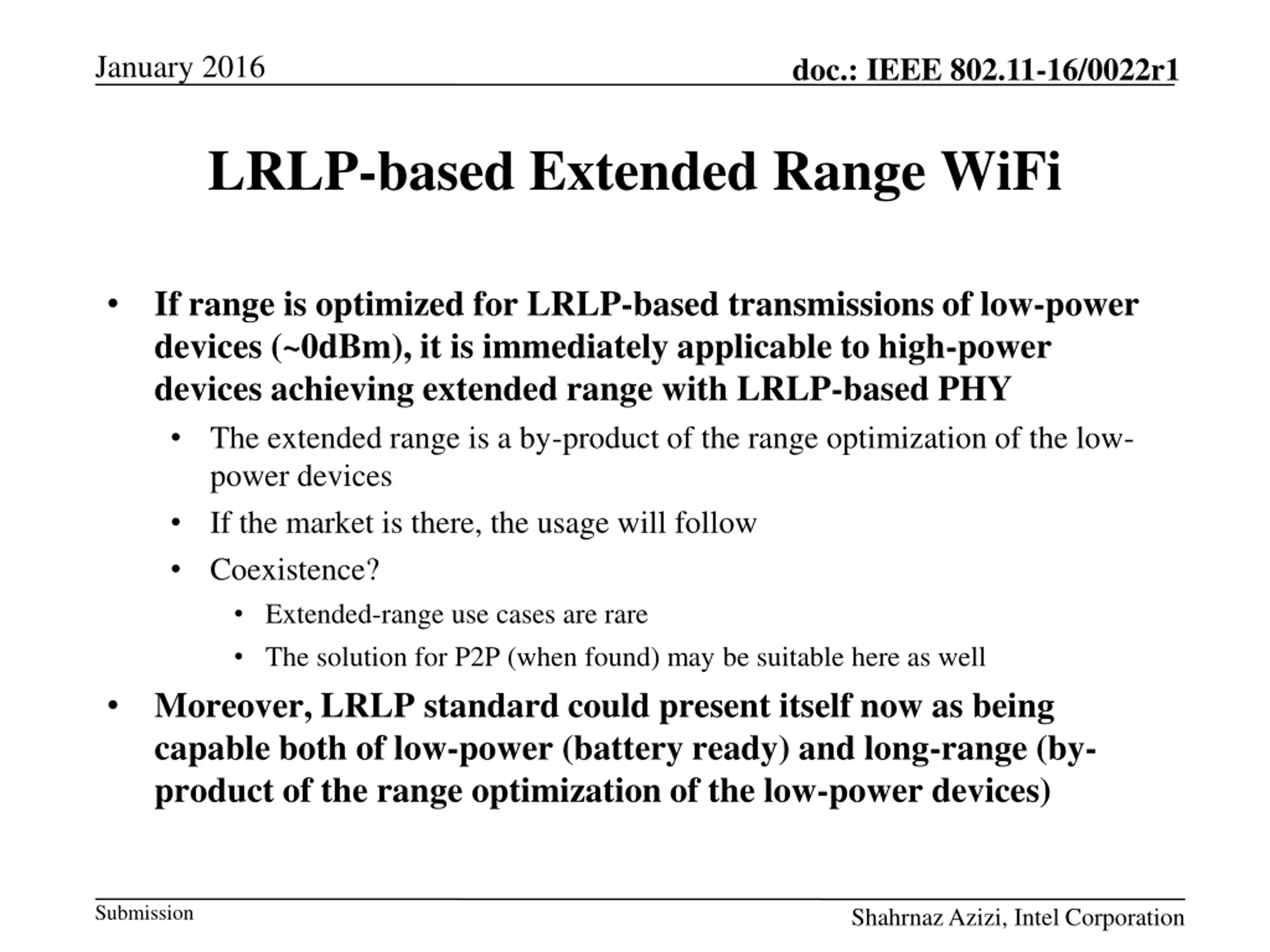 January 2016 doc.: IEEE 802.11-16/0022r1 LRLP-based Extended Range WiFi If range is optimized for LRLP-based transmissions of low-power devices (~0dBm), it is immediately applicable to high-power devices achieving extended range with LRLP-based PHY The extended range is a by-product of the range optimization of the low- power devices If the market is there, the usage will follow Coexistence? Extended-range use cases are rare The solution for P2P (when found) may be suitable here as well Moreover, LRLP standard could present itself now as being capable both of low-power (battery ready) and long-range (by- product of the range optimization of the low-power devices) Submission Shahrnaz Azizi, Intel Corporation