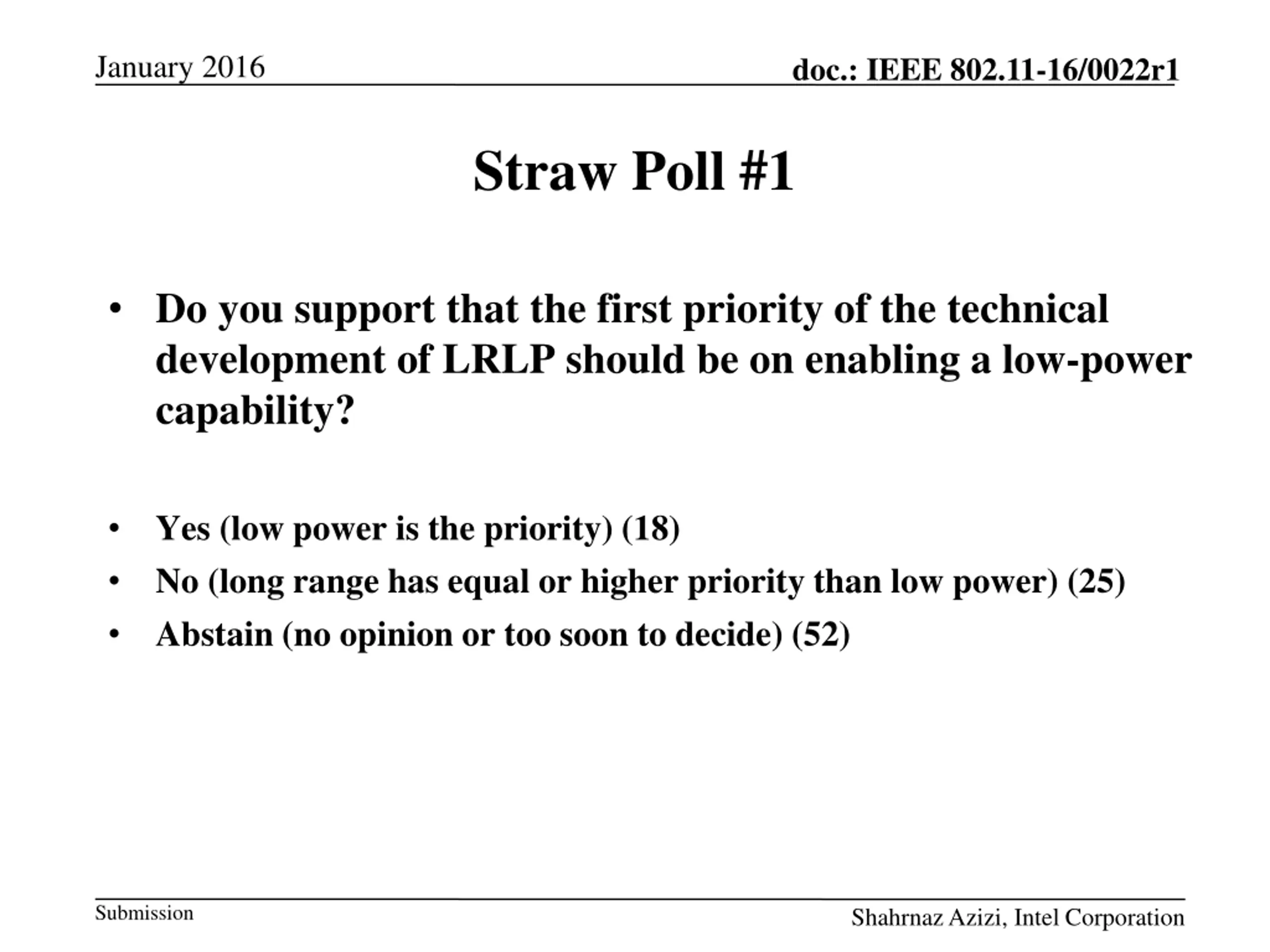 January 2016 doc.: IEEE 802.11-16/0022r1 Straw Poll #1 Do you support that the first priority of the technical development of LRLP should be on enabling a low-power capability? Yes (low power is the priority) (18) No (long range has equal or higher priority than low power) (25) Abstain (no opinion or too soon to decide) (52) Submission Shahrnaz Azizi, Intel Corporation