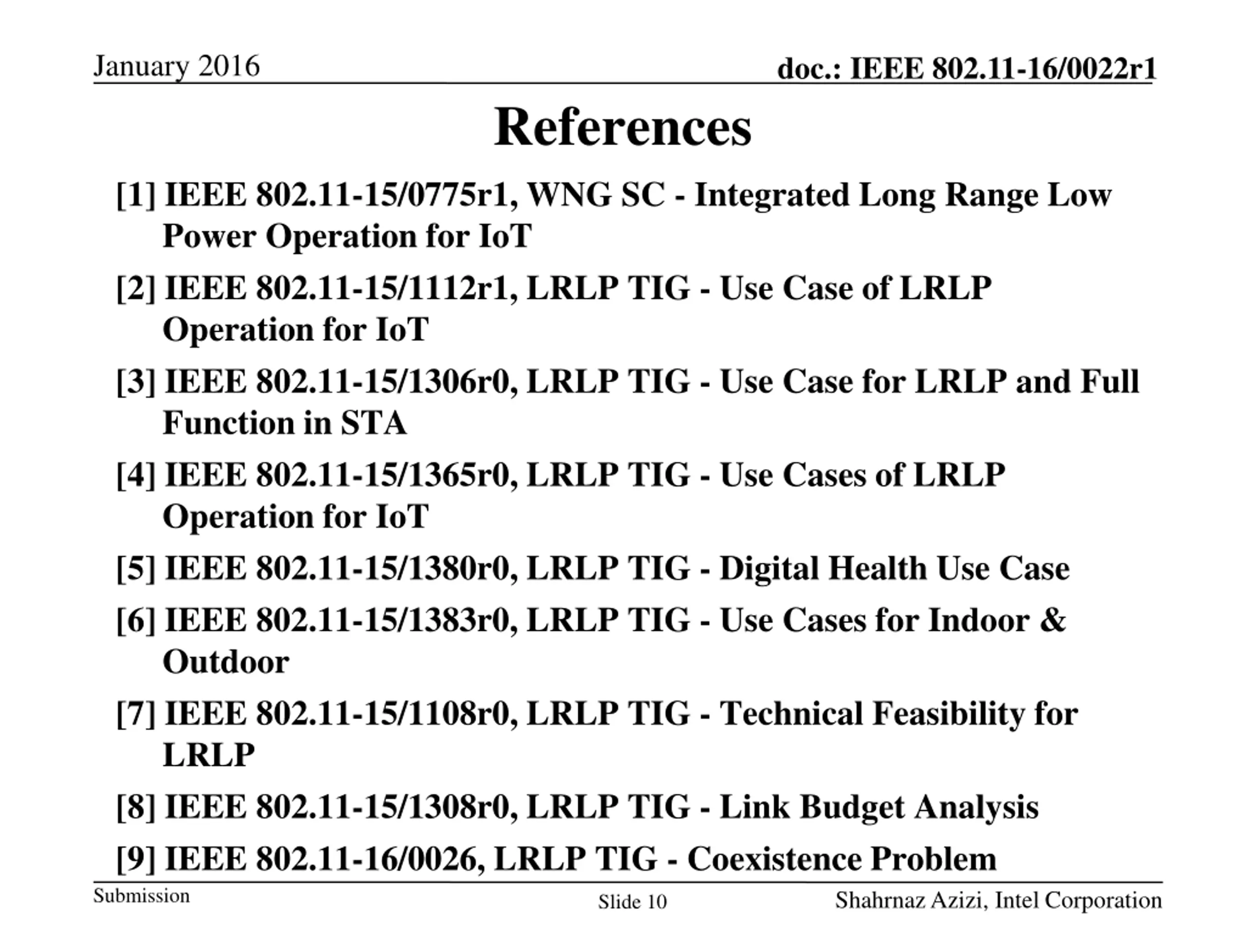 January 2016 doc.: IEEE 802.11-16/0022r1 References [1] IEEE 802.11-15/0775r1, WNG SC - Integrated Long Range Low Power Operation for IoT [2] IEEE 802.11-15/1112r1, LRLP TIG - Use Case of LRLP Operation for IoT [3] IEEE 802.11-15/1306r0, LRLP TIG - Use Case for LRLP and Full Function in STA [4] IEEE 802.11-15/1365r0, LRLP TIG - Use Cases of LRLP Operation for IoT [5] IEEE 802.11-15/1380r0, LRLP TIG - Digital Health Use Case [6] IEEE 802.11-15/1383r0, LRLP TIG - Use Cases for Indoor & Outdoor [7] IEEE 802.11-15/1108r0, LRLP TIG - Technical Feasibility for LRLP [8] IEEE 802.11-15/1308r0, LRLP TIG - Link Budget Analysis [9] IEEE 802.11-16/0026, LRLP TIG - Coexistence Problem Submission Shahrnaz Azizi, Intel Corporation Slide 10