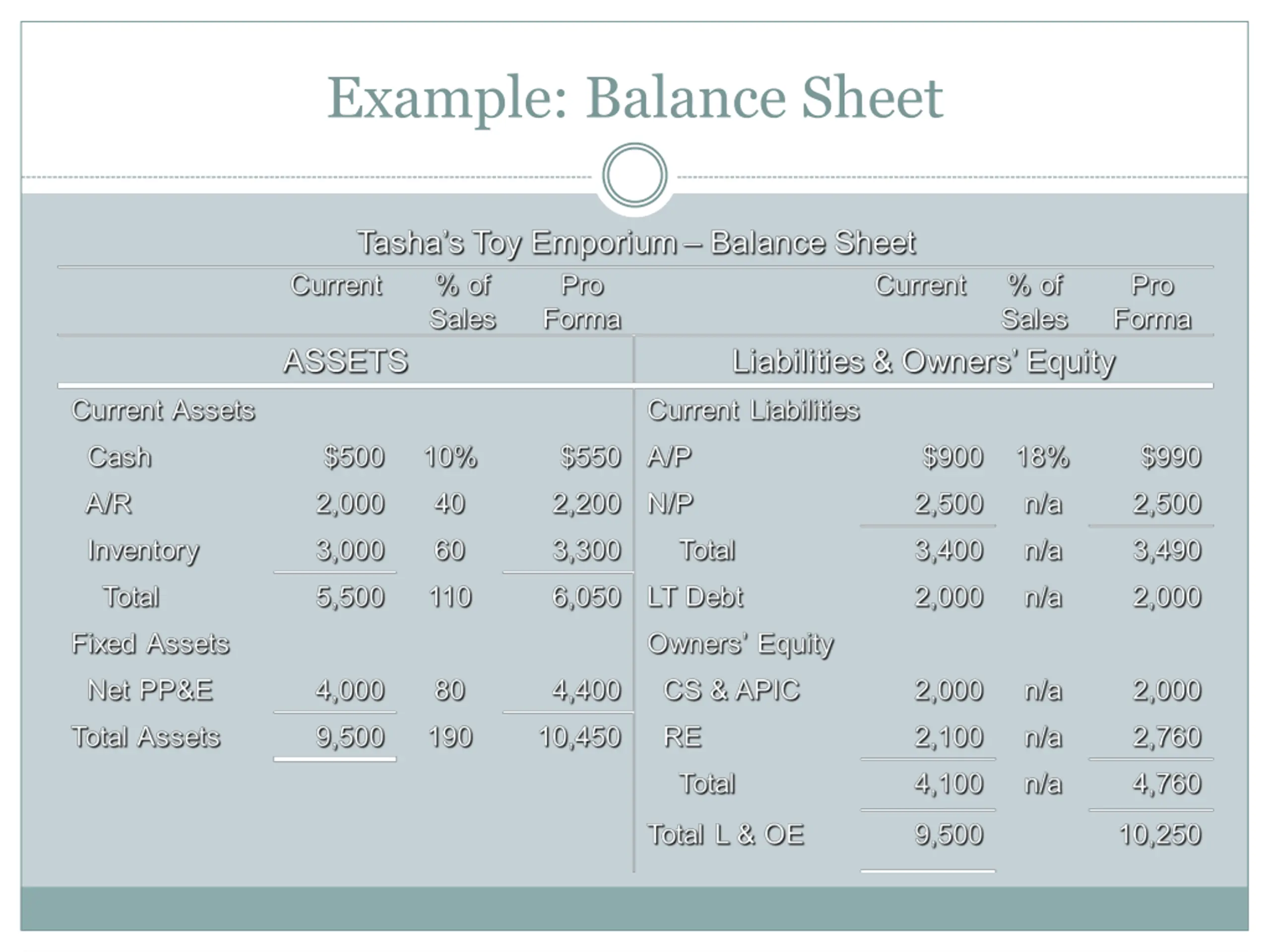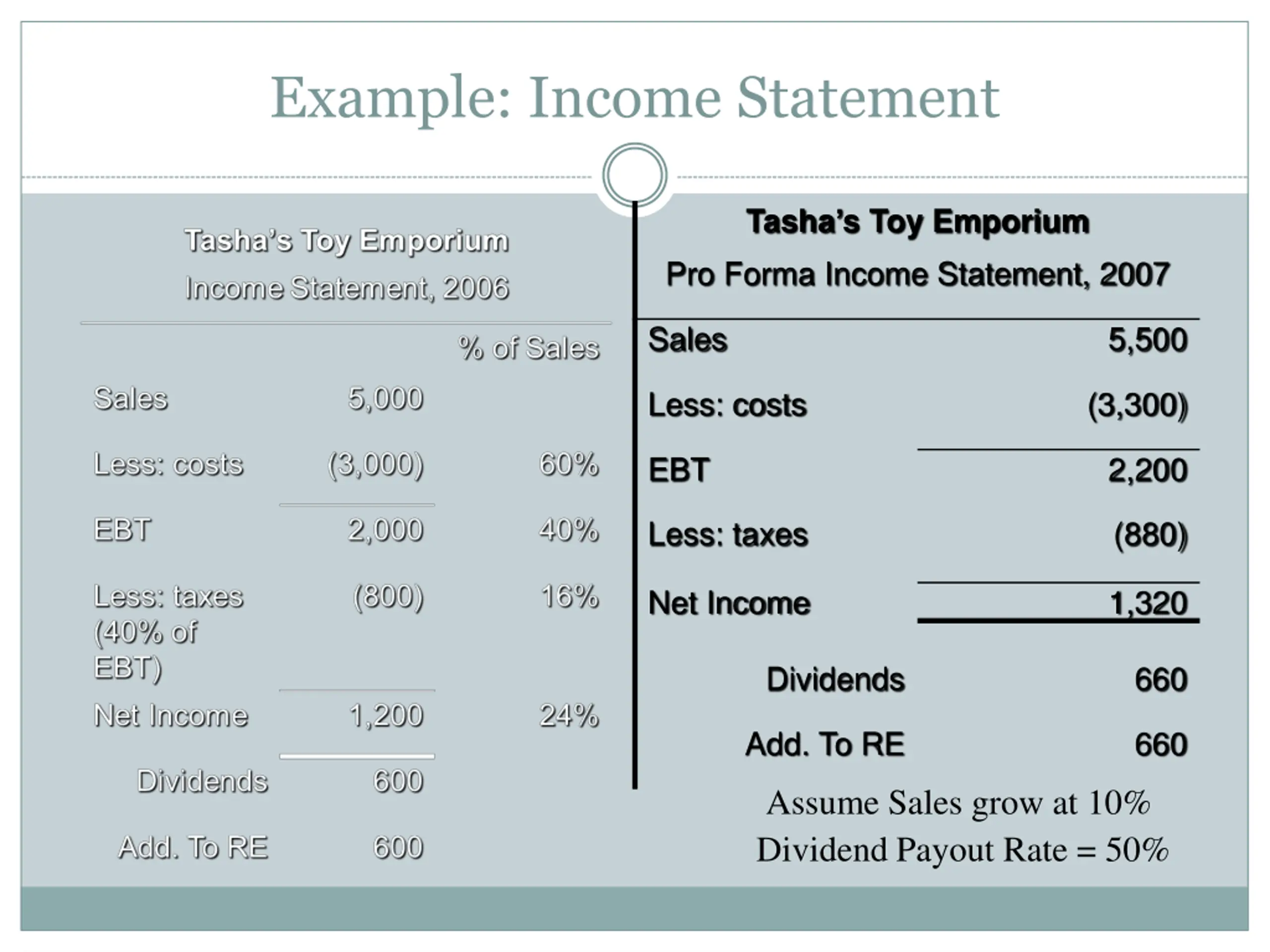 Example: Income Statement Tasha s Toy Emporium Pro Forma Income Statement, 2007 Sales 5,500 Less: costs (3,300) EBT 2,200 Less: taxes (880) Net Income 1,320 Dividends 660 Add. To RE 660 Assume Sales grow at 10% Dividend Payout Rate = 50%