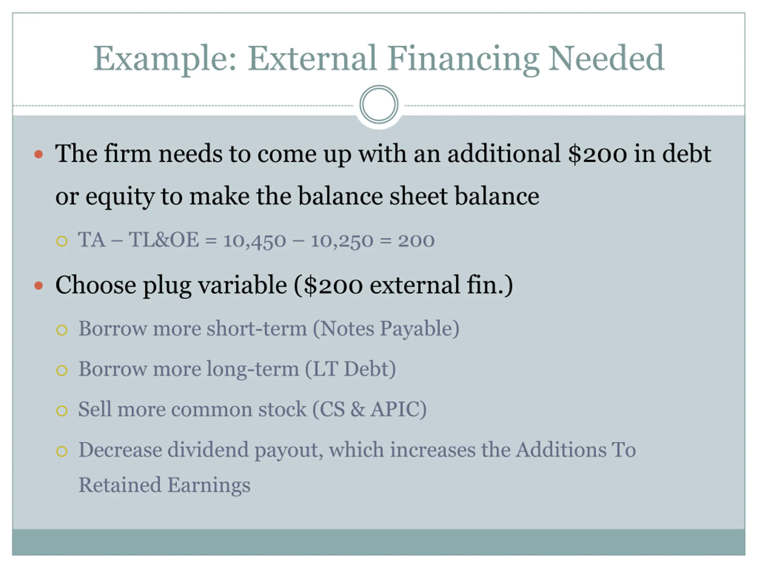 Example: External Financing Needed The firm needs to come up with an additional $200 in debt or equity to make the balance sheet balance TA TL&OE = 10,450 10,250 = 200 Choose plug variable ($200 external fin.) Borrow more short-term (Notes Payable) Borrow more long-term (LT Debt) Sell more common stock (CS & APIC) Decrease dividend payout, which increases the Additions To Retained Earnings