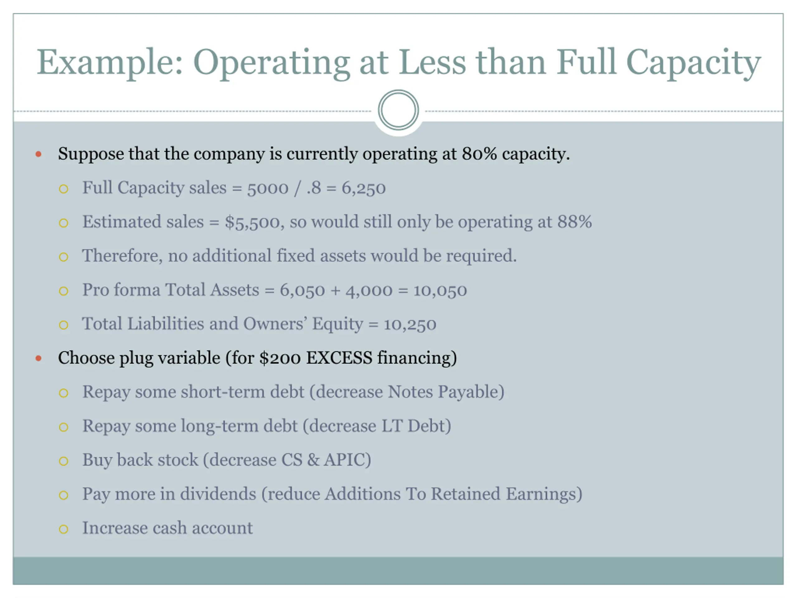Example: Operating at Less than Full Capacity Suppose that the company is currently operating at 80% capacity. Full Capacity sales = 5000 / .8 = 6,250 Estimated sales = $5,500, so would still only be operating at 88% Therefore, no additional fixed assets would be required. Pro forma Total Assets = 6,050 + 4,000 = 10,050 Total Liabilities and Owners Equity = 10,250 Choose plug variable (for $200 EXCESS financing) Repay some short-term debt (decrease Notes Payable) Repay some long-term debt (decrease LT Debt) Buy back stock (decrease CS & APIC) Pay more in dividends (reduce Additions To Retained Earnings) Increase cash account