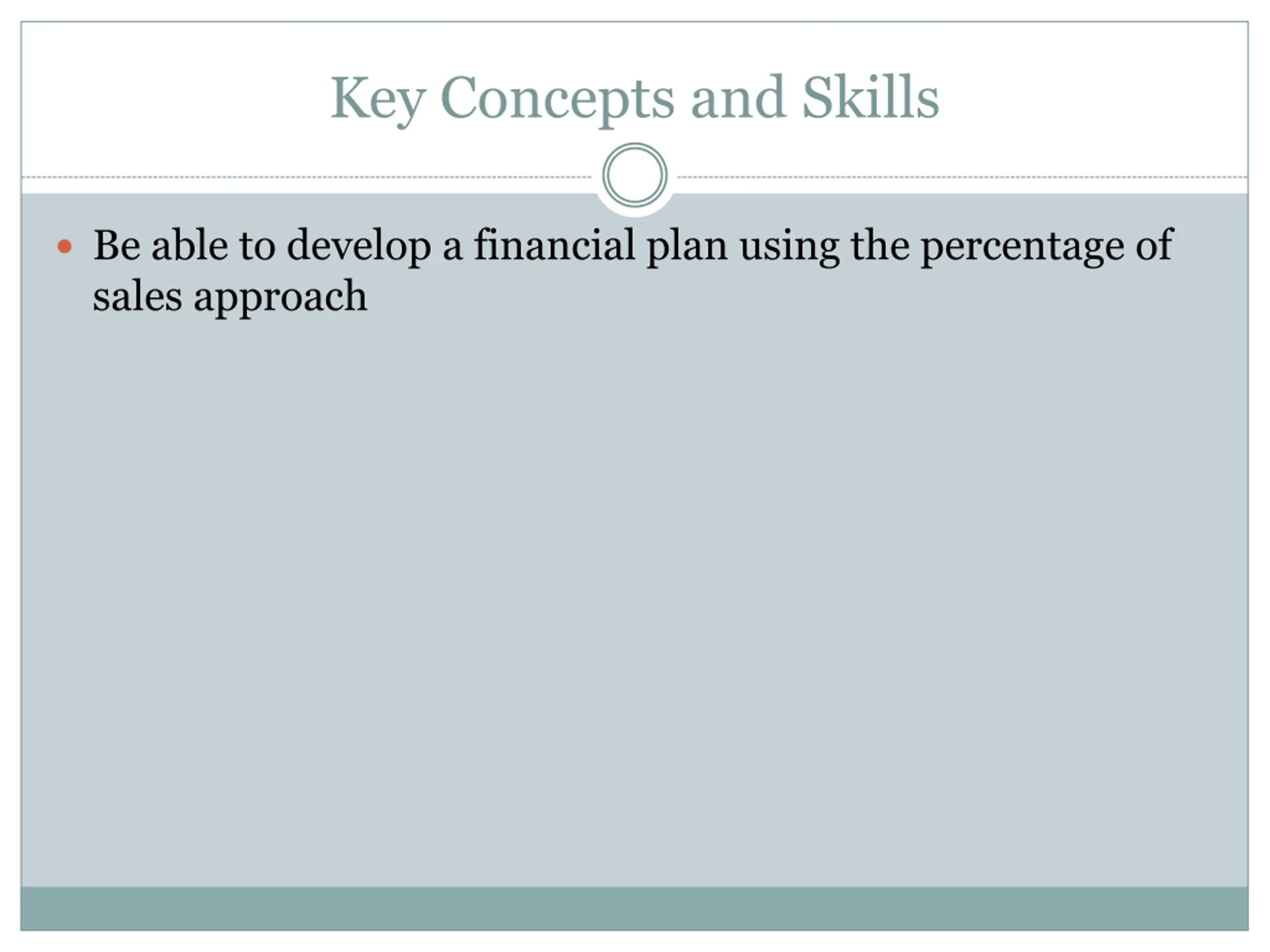 Key Concepts and Skills Be able to develop a financial plan using the percentage of sales approach