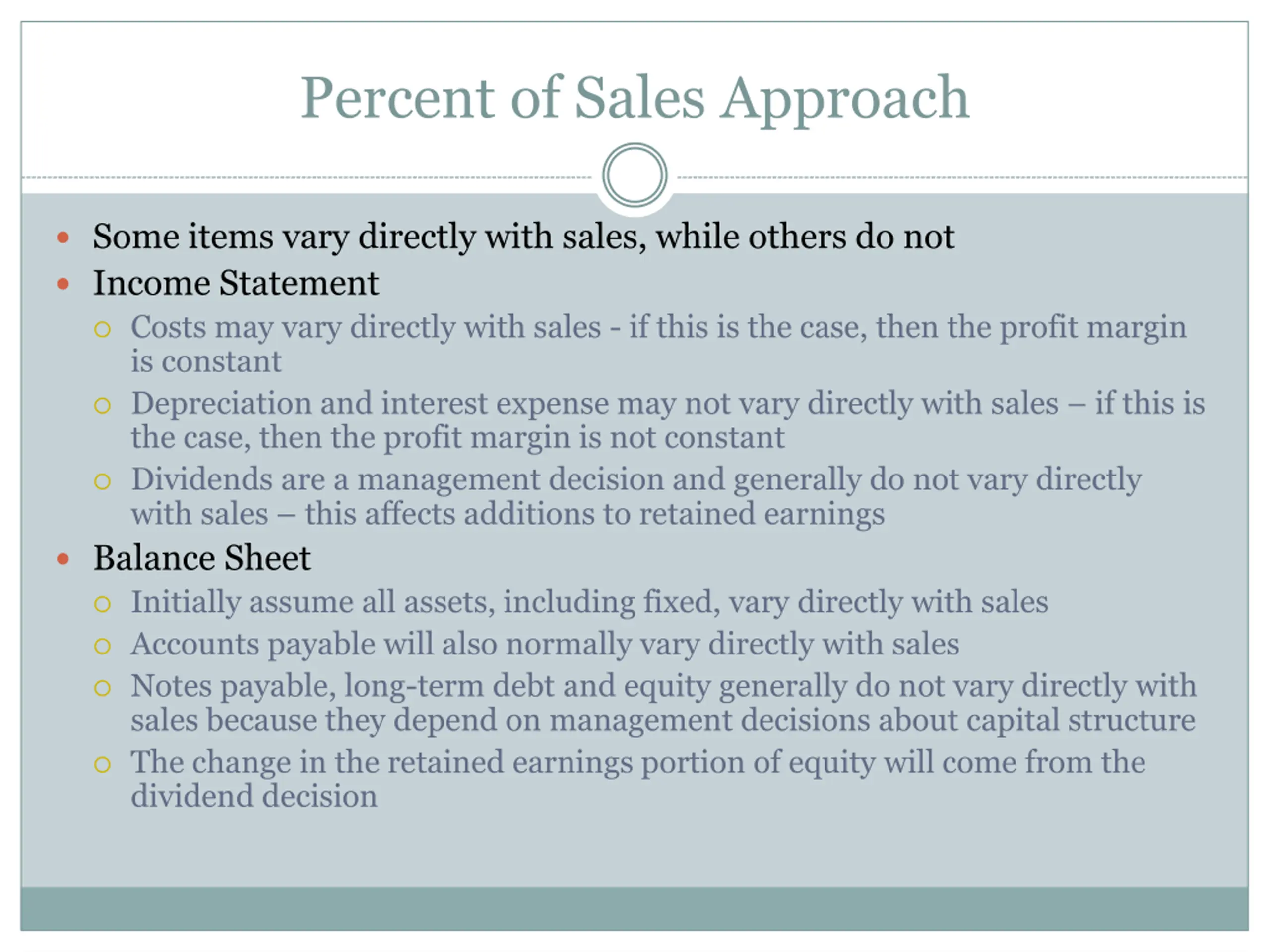 Percent of Sales Approach Some items vary directly with sales, while others do not Income Statement Costs may vary directly with sales - if this is the case, then the profit margin is constant Depreciation and interest expense may not vary directly with sales if this is the case, then the profit margin is not constant Dividends are a management decision and generally do not vary directly with sales this affects additions to retained earnings Balance Sheet Initially assume all assets, including fixed, vary directly with sales Accounts payable will also normally vary directly with sales Notes payable, long-term debt and equity generally do not vary directly with sales because they depend on management decisions about capital structure The change in the retained earnings portion of equity will come from the dividend decision