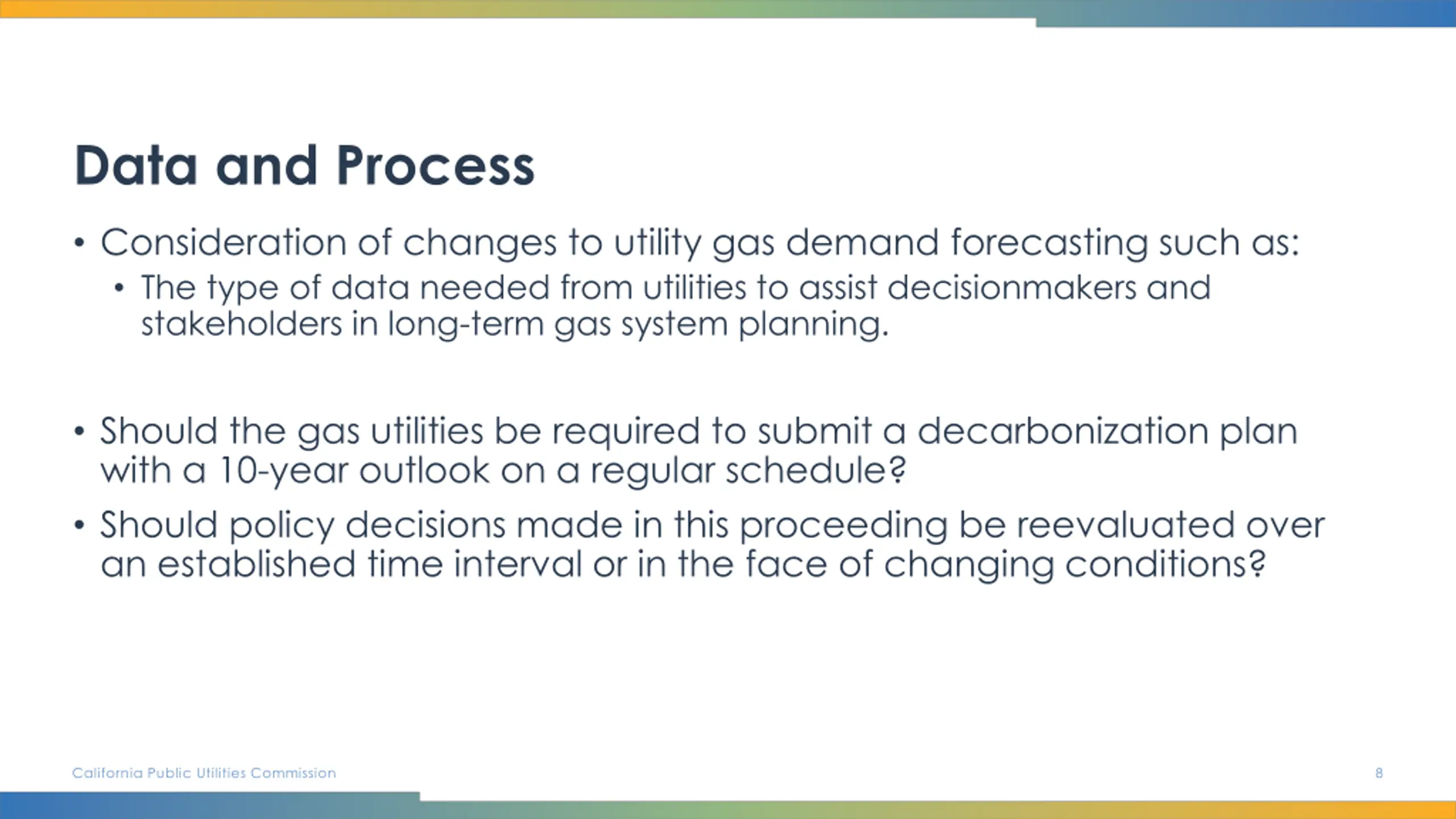 Data and Process Consideration of changes to utility gas demand forecasting such as: The type of data needed from utilities to assist decisionmakers and stakeholders in long-term gas system planning. Should the gas utilities be required to submit a decarbonization plan with a 10-year outlook on a regular schedule? Should policy decisions made in this proceeding be reevaluated over an established time interval or in the face of changing conditions? California Public Utilities Commission 8