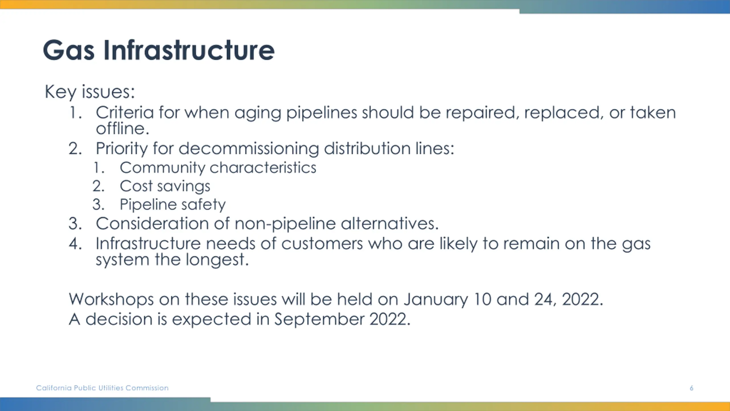 Gas Infrastructure Key issues: 1. Criteria for when aging pipelines should be repaired, replaced, or taken offline. 2. Priority for decommissioning distribution lines: 1. Community characteristics 2. Cost savings 3. Pipeline safety 3. Consideration of non-pipeline alternatives. 4. Infrastructure needs of customers who are likely to remain on the gas system the longest. Workshops on these issues will be held on January 10 and 24, 2022. A decision is expected in September 2022. California Public Utilities Commission 6