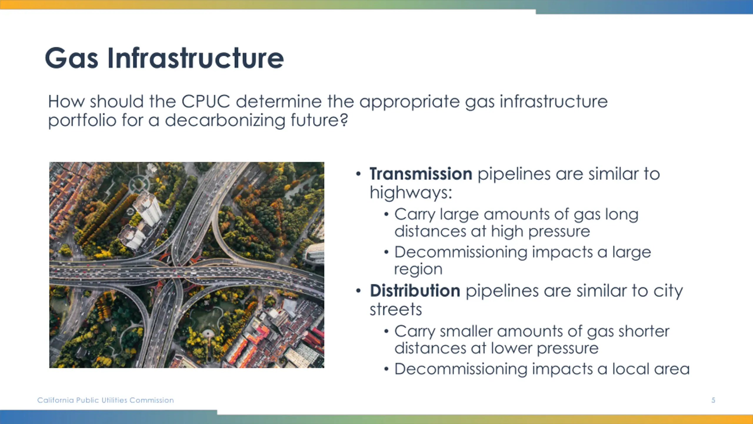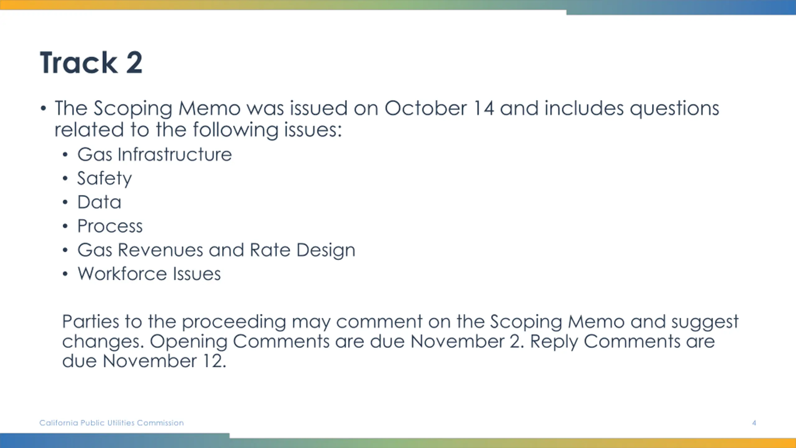 Track 2 The Scoping Memo was issued on October 14 and includes questions related to the following issues: Gas Infrastructure Safety Data Process Gas Revenues and Rate Design Workforce Issues Parties to the proceeding may comment on the Scoping Memo and suggest changes. Opening Comments are due November 2. Reply Comments are due November 12. California Public Utilities Commission 4