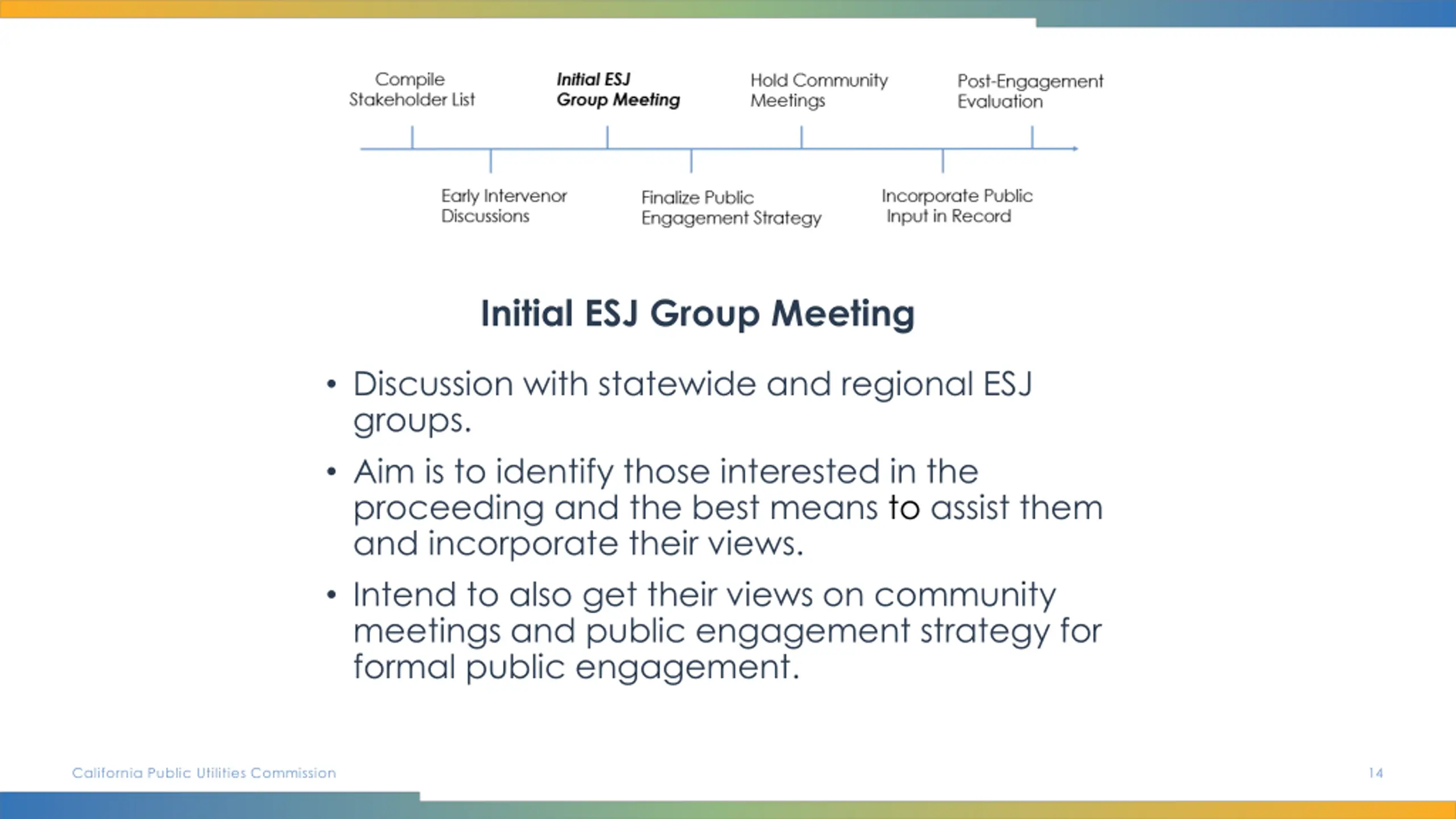Initial ESJ Group Meeting Discussion with statewide and regional ESJ groups. Aim is to identify those interested in the proceeding and the best means to assist them and incorporate their views. Intend to also get their views on community meetings and public engagement strategy for formal public engagement. California Public Utilities Commission 14