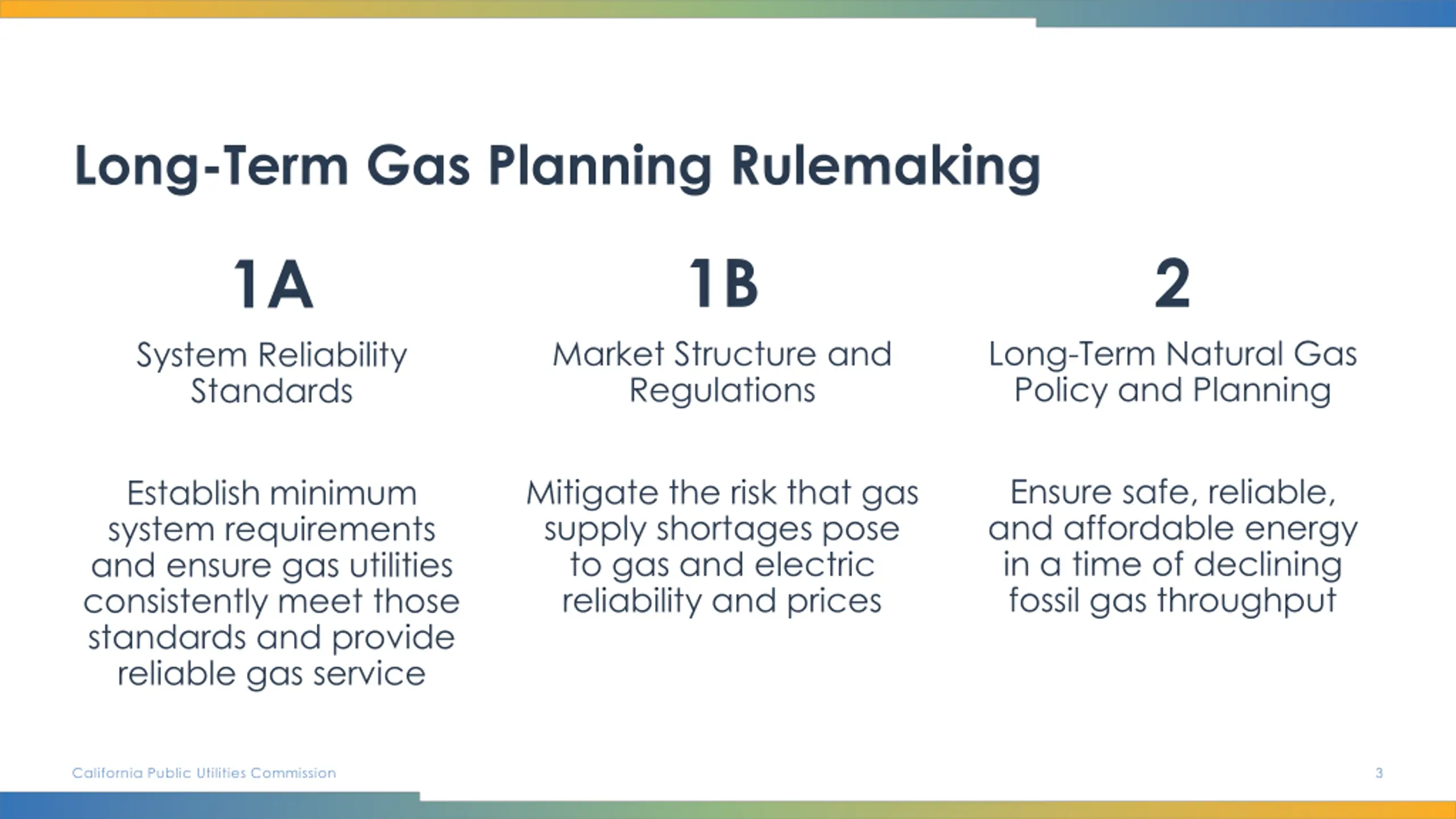Long-Term Gas Planning Rulemaking 2 1B 1A Long-Term Natural Gas Policy and Planning Market Structure and Regulations System Reliability Standards Ensure safe, reliable, and affordable energy in a time of declining fossil gas throughput Mitigate the risk that gas supply shortages pose to gas and electric reliability and prices Establish minimum system requirements and ensure gas utilities consistently meet those standards and provide reliable gas service California Public Utilities Commission 3