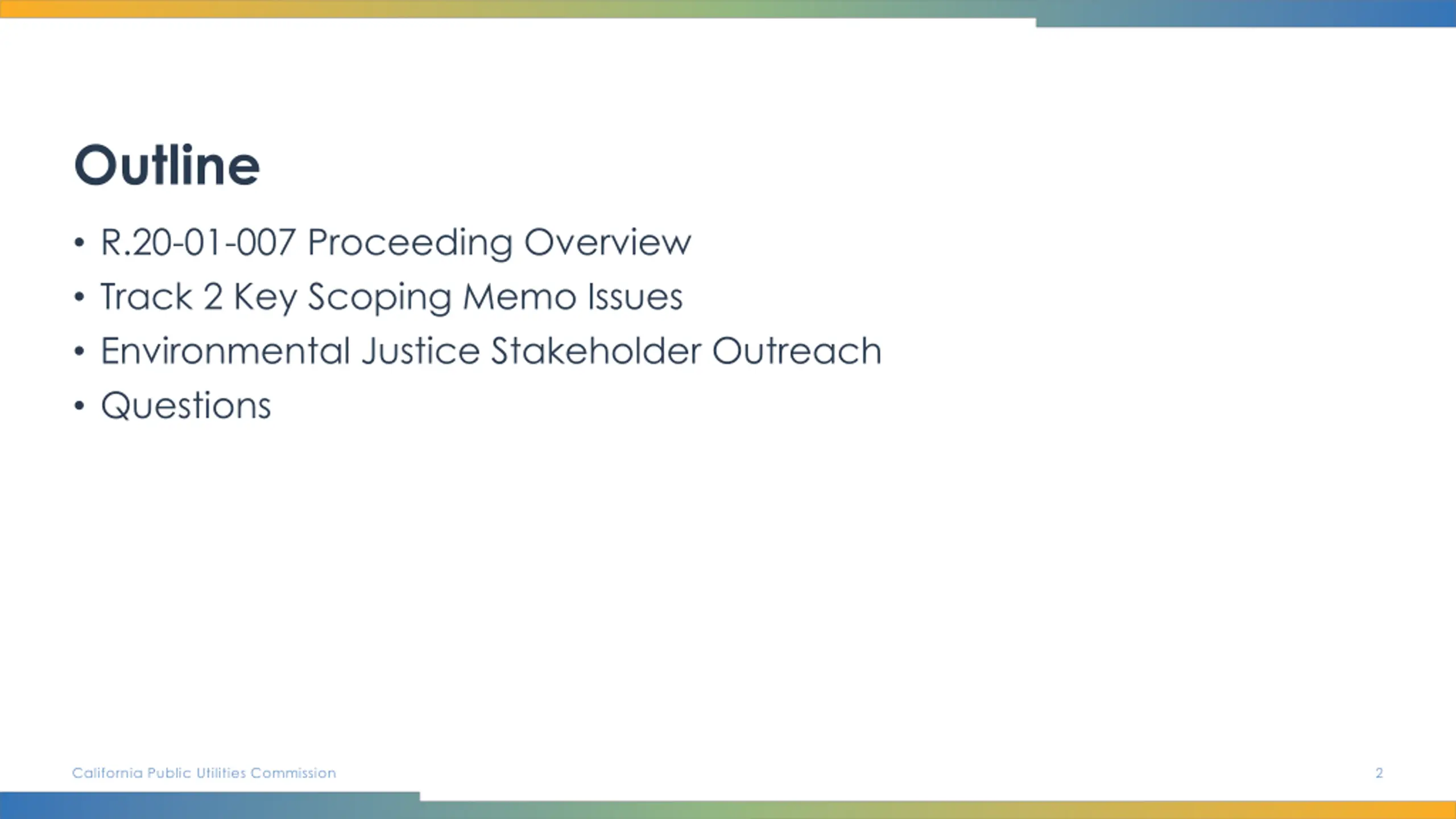 Outline R.20-01-007 Proceeding Overview Track 2 Key Scoping Memo Issues Environmental Justice Stakeholder Outreach Questions California Public Utilities Commission 2