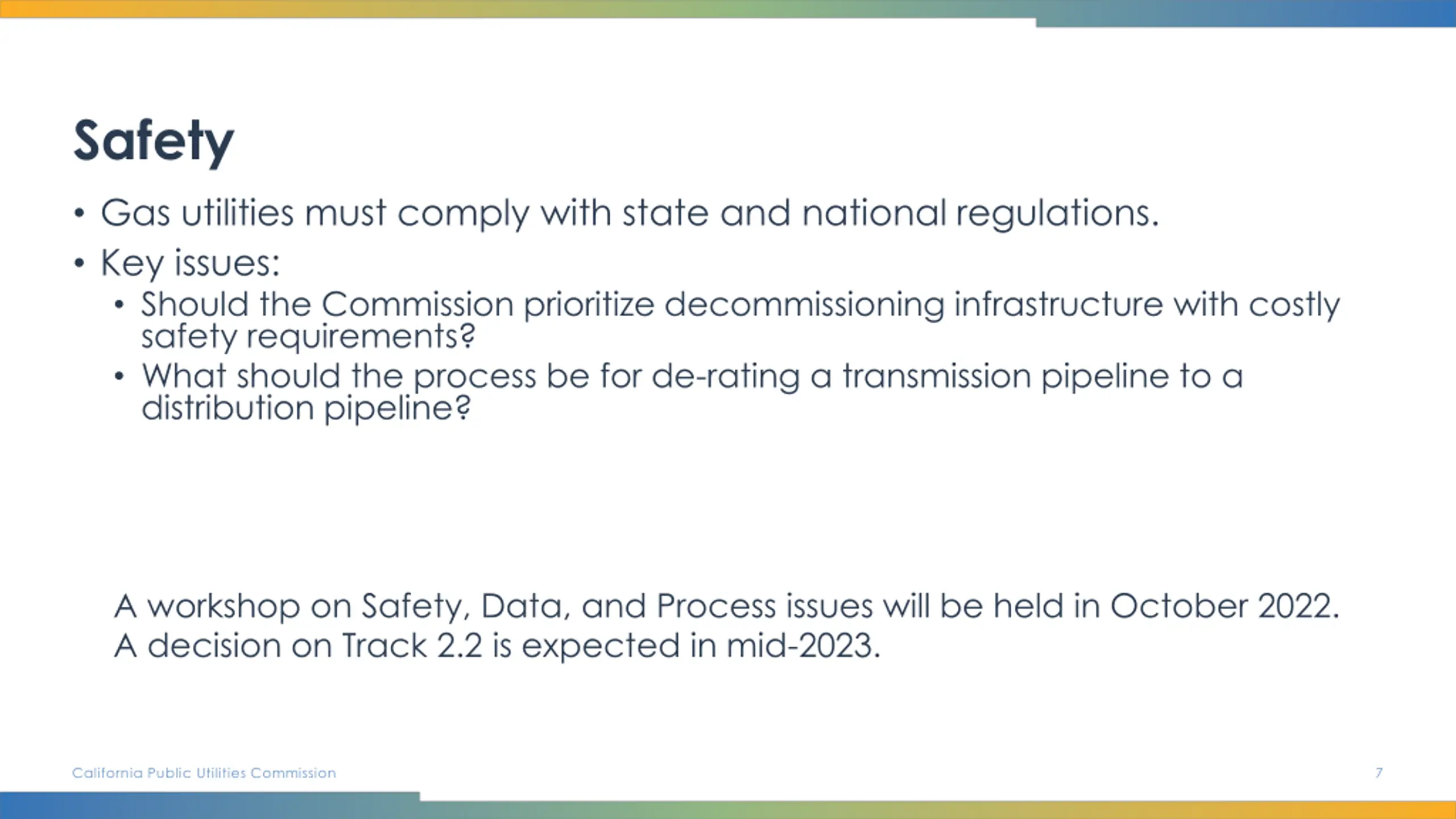 Safety Gas utilities must comply with state and national regulations. Key issues: Should the Commission prioritize decommissioning infrastructure with costly safety requirements? What should the process be for de-rating a transmission pipeline to a distribution pipeline? A workshop on Safety, Data, and Process issues will be held in October 2022. A decision on Track 2.2 is expected in mid-2023. California Public Utilities Commission 7