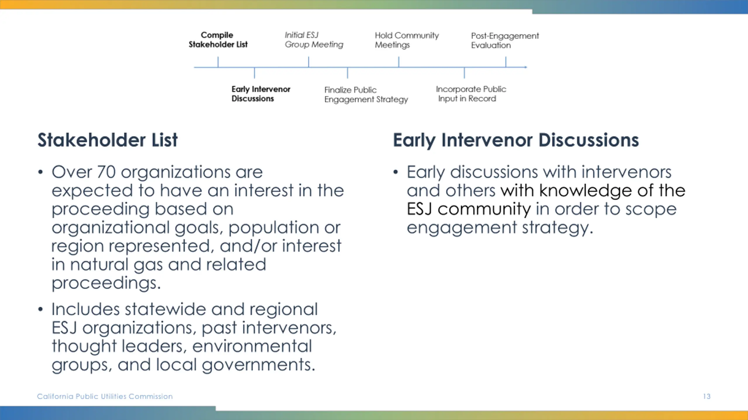 Stakeholder List Early Intervenor Discussions Over 70 organizations are expected to have an interest in the proceeding based on organizational goals, population or region represented, and/or interest in natural gas and related proceedings. Includes statewide and regional ESJ organizations, past intervenors, thought leaders, environmental groups, and local governments. Early discussions with intervenors and others with knowledge of the ESJ community in order to scope engagement strategy. California Public Utilities Commission 13
