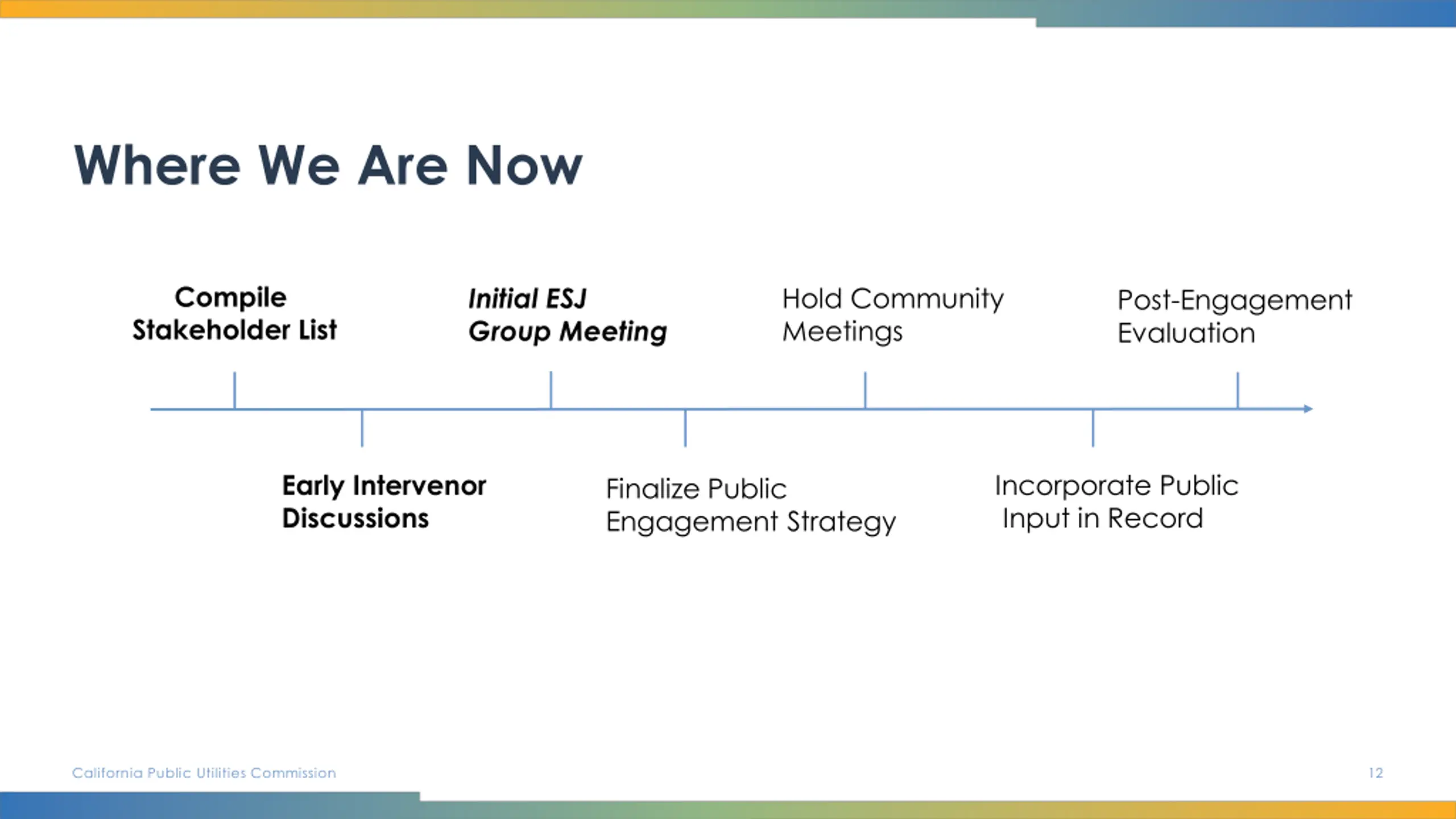 Proposed Engagement Plan Compile Stakeholder List Initial ESJ Group Meeting Hold Community Meetings Post-Engagement Evaluation Early Intervenor Discussions Incorporate Public Input in Record Finalize Public Engagement Strategy Early Engagement Formal Public Engagement California Public Utilities Commission 11