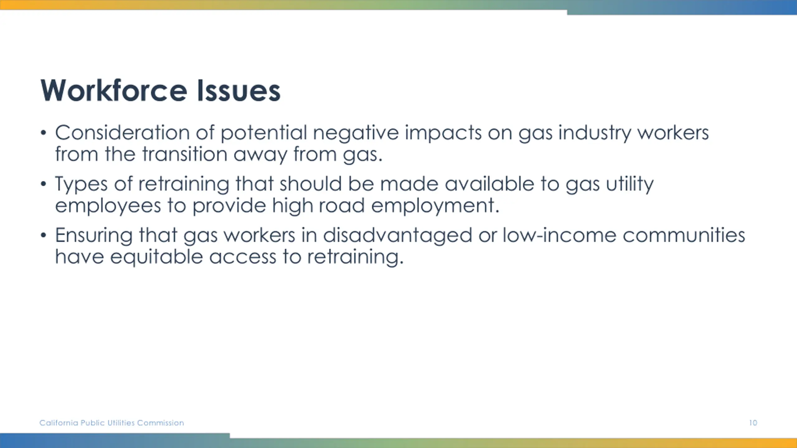 Workforce Issues Consideration of potential negative impacts on gas industry workers from the transition away from gas. Types of retraining that should be made available to gas utility employees to provide high road employment. Ensuring that gas workers in disadvantaged or low-income communities have equitable access to retraining. California Public Utilities Commission 10