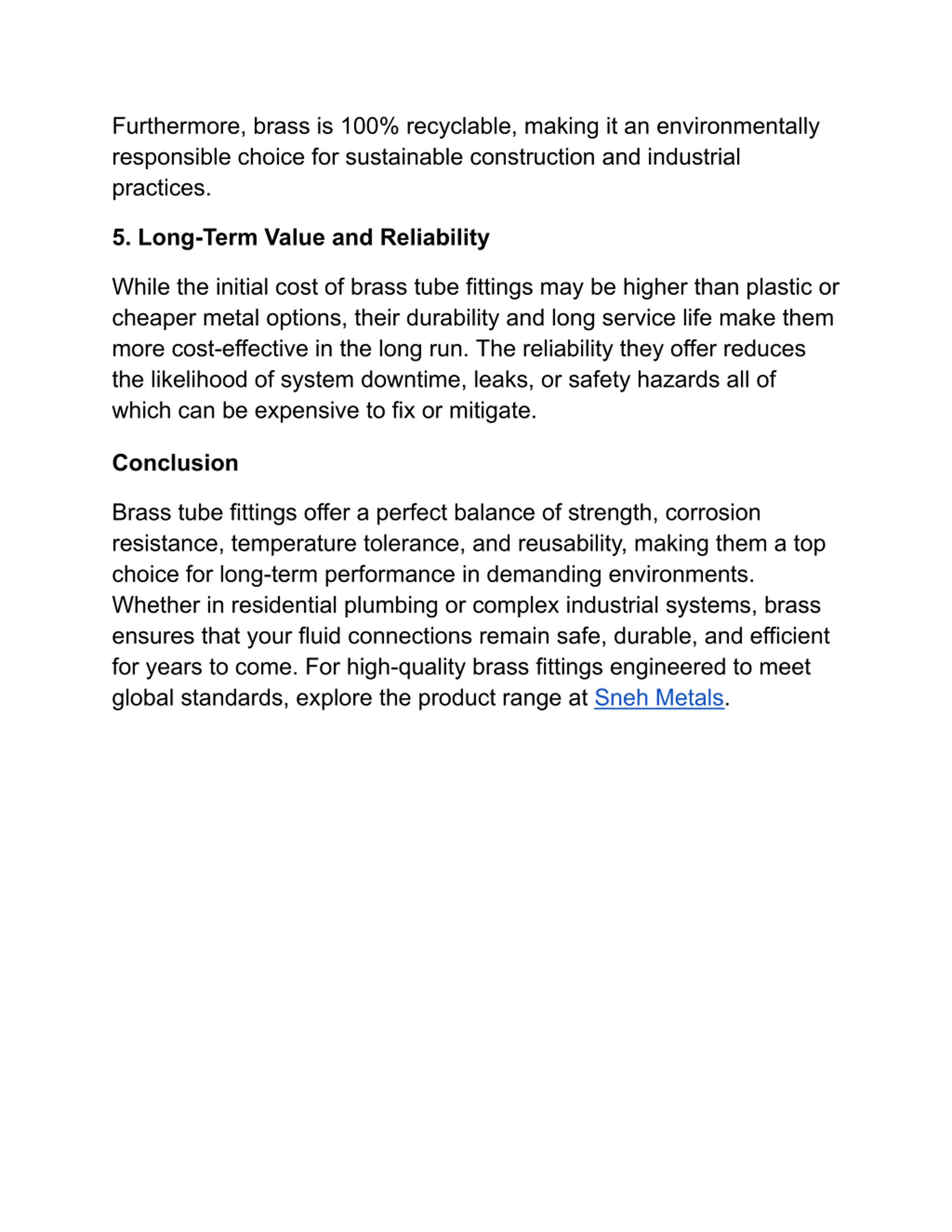 Furthermore, brass is 100% recyclable, making it an environmentally responsible choice for sustainable construction and industrial practices. 5. Long-Term Value and Reliability While the initial cost of brass tube fittings may be higher than plastic or cheaper metal options, their durability and long service life make them more cost-effective in the long run. The reliability they offer reduces the likelihood of system downtime, leaks, or safety hazards all of which can be expensive to fix or mitigate. Conclusion Brass tube fittings offer a perfect balance of strength, corrosion resistance, temperature tolerance, and reusability, making them a top choice for long-term performance in demanding environments. Whether in residential plumbing or complex industrial systems, brass ensures that your fluid connections remain safe, durable, and efficient for years to come. For high-quality brass fittings engineered to meet global standards, explore the product range at Sneh Metals.