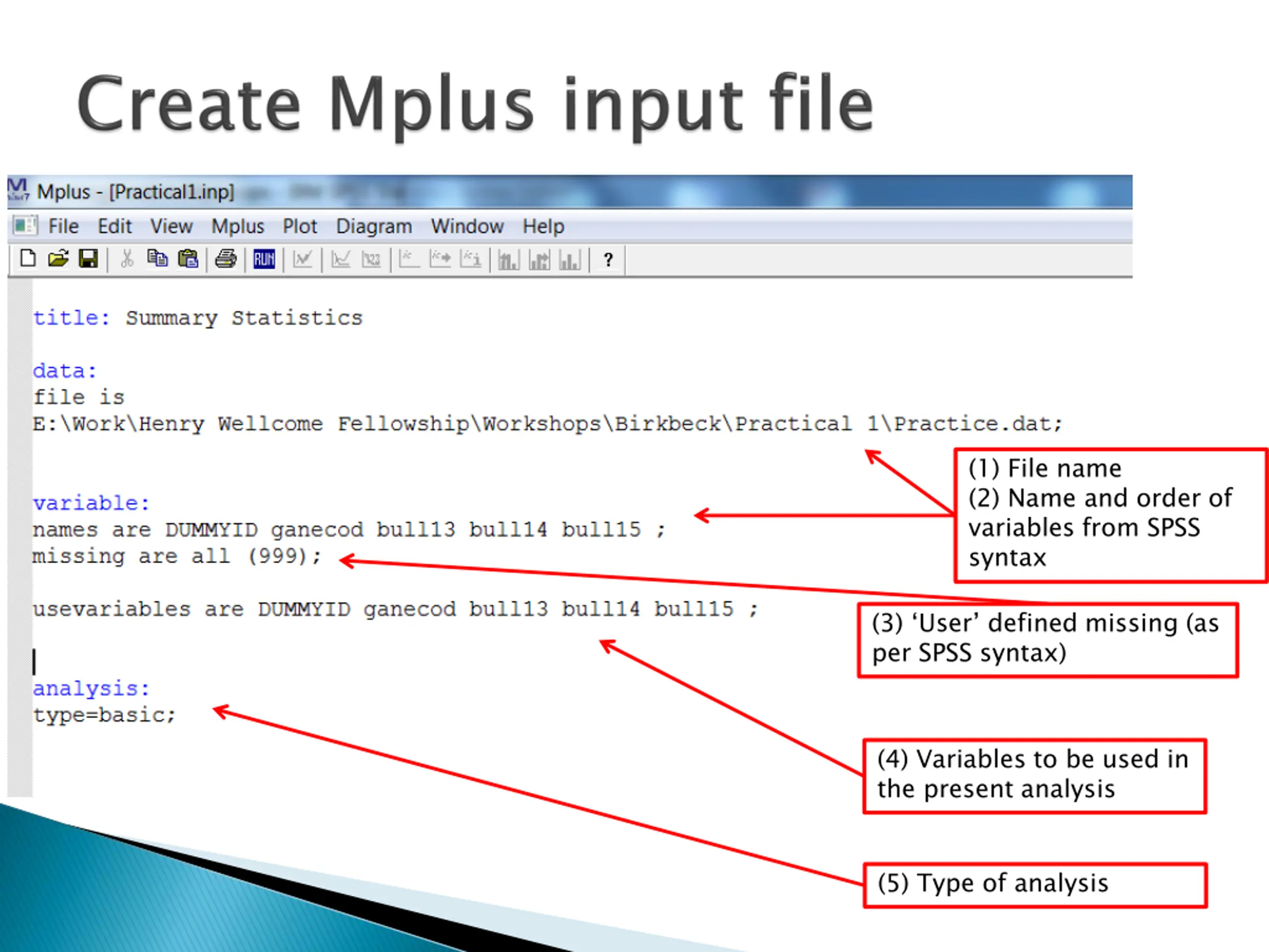 Get the data into Mplus using the syntax file. Run syntax (Open .dat file in mplus to check for symbol error) Open a new mplus input file. Add the following subsections: title data variables (make sure these are in the correct order!!) analysis Run input file