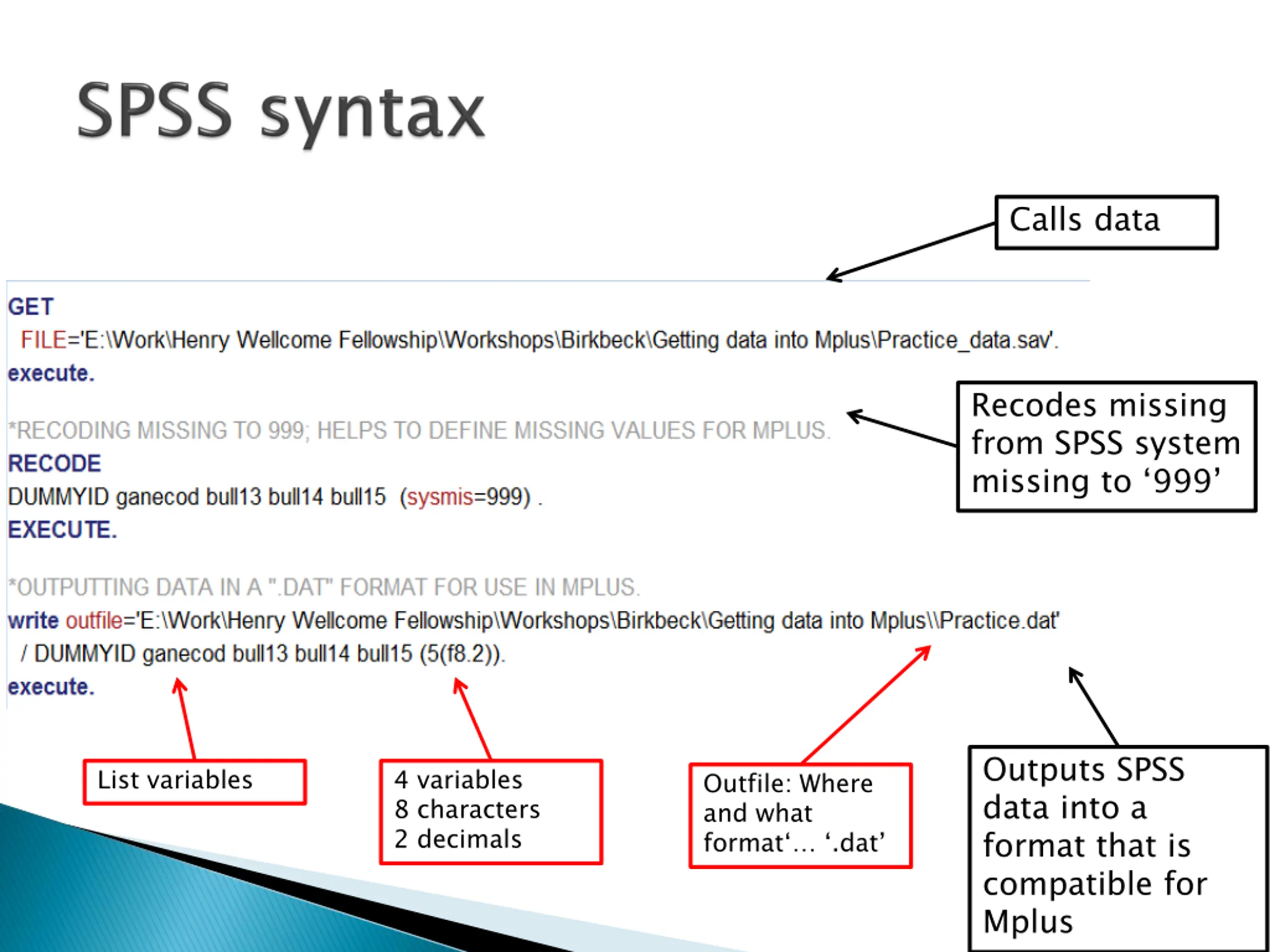 Calls data Recodes missing from SPSS system missing to 999 Outputs SPSS data into a format that is compatible for Mplus List variables 4 variables 8 characters 2 decimals Outfile: Where and what format .dat