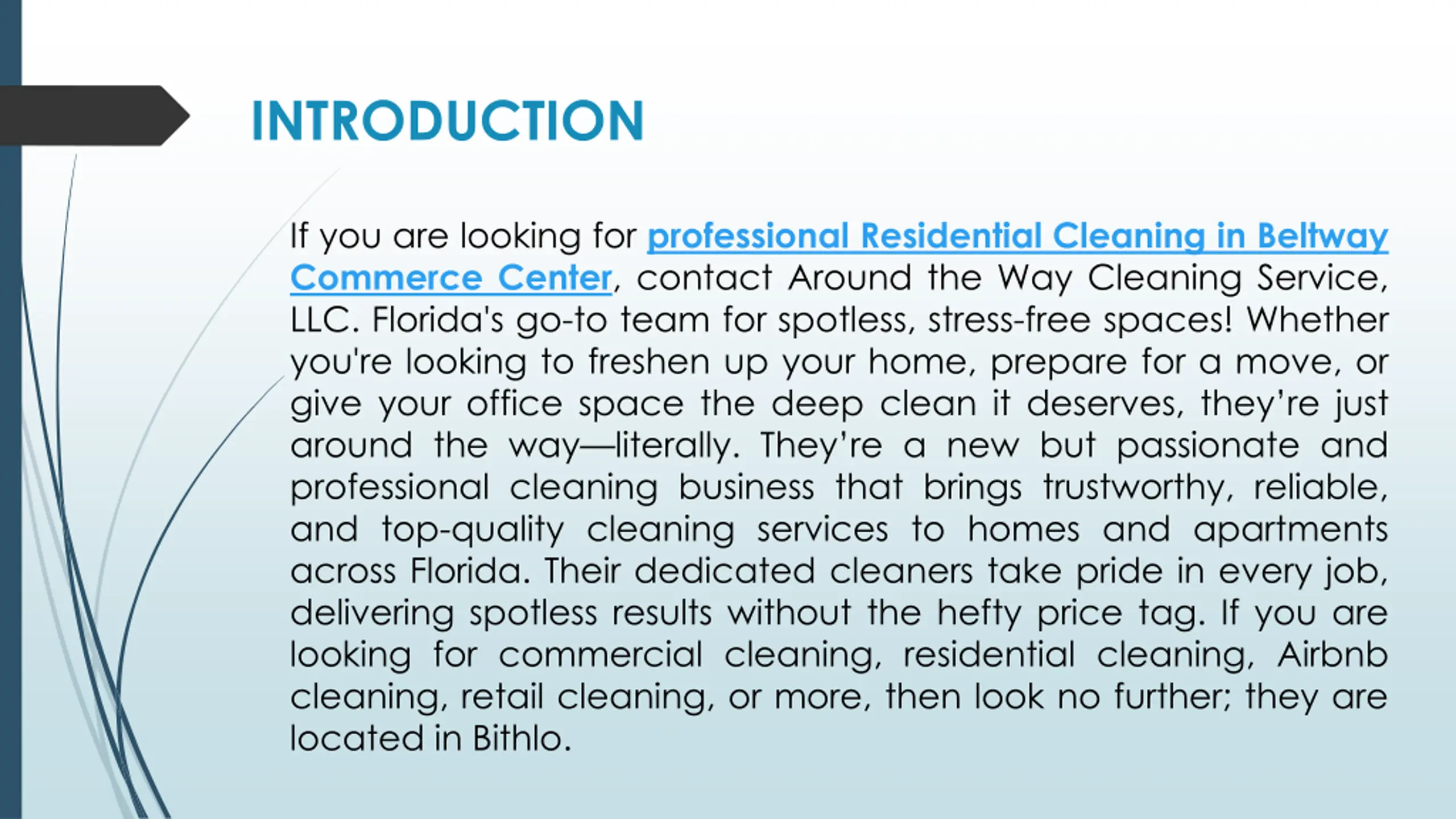 INTRODUCTION If you are looking for professional Residential Cleaning in Beltway Commerce Center, contact Around the Way Cleaning Service, LLC. Florida's go-to team for spotless, stress-free spaces! Whether you're looking to freshen up your home, prepare for a move, or give your office space the deep clean it deserves, they re just around the way literally. They re a new but passionate and professional cleaning business that brings trustworthy, reliable, and top-quality cleaning services to homes and apartments across Florida. Their dedicated cleaners take pride in every job, delivering spotless results without the hefty price tag. If you are looking for commercial cleaning, residential cleaning, Airbnb cleaning, retail cleaning, or more, then look no further; they are located in Bithlo.