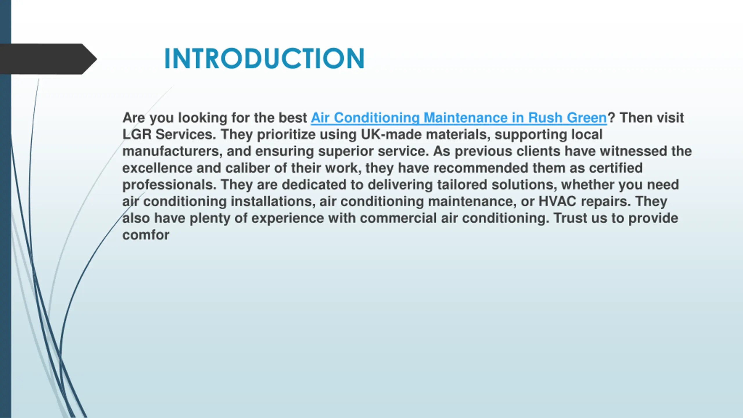 INTRODUCTION Are you looking for the best Air Conditioning Maintenance in Rush Green? Then visit LGR Services. They prioritize using UK-made materials, supporting local manufacturers, and ensuring superior service. As previous clients have witnessed the excellence and caliber of their work, they have recommended them as certified professionals. They are dedicated to delivering tailored solutions, whether you need air conditioning installations, air conditioning maintenance, or HVAC repairs. They also have plenty of experience with commercial air conditioning. Trust us to provide comfor
