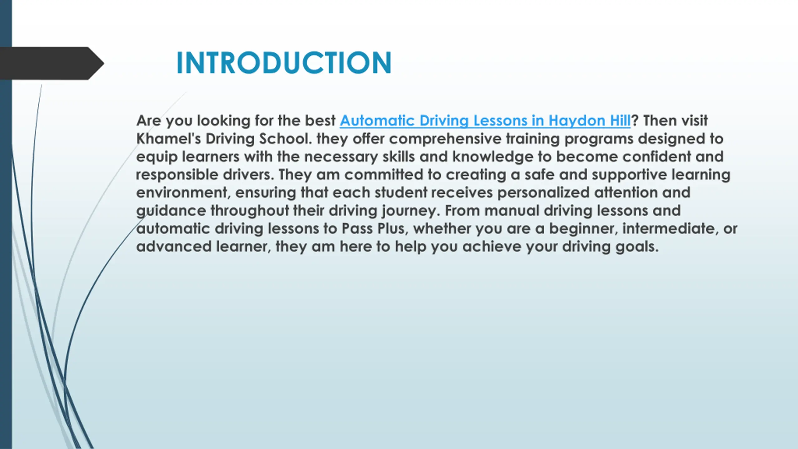 2. INTRODUCTION Are you looking for the best Automatic Driving Lessons in Haydon Hill? Then visit Khamel's Driving School. they offer comprehensive training programs designed to equip learners with the necessary skills and knowledge to become confident and responsible drivers. They am committed to creating a safe and supportive learning environment, ensuring that each student receives personalized attention and guidance throughout their driving journey. From manual driving lessons and automatic driving lessons to Pass Plus, whether you are a beginner, intermediate, or advanced learner, they am here to help you achieve your driving goals.