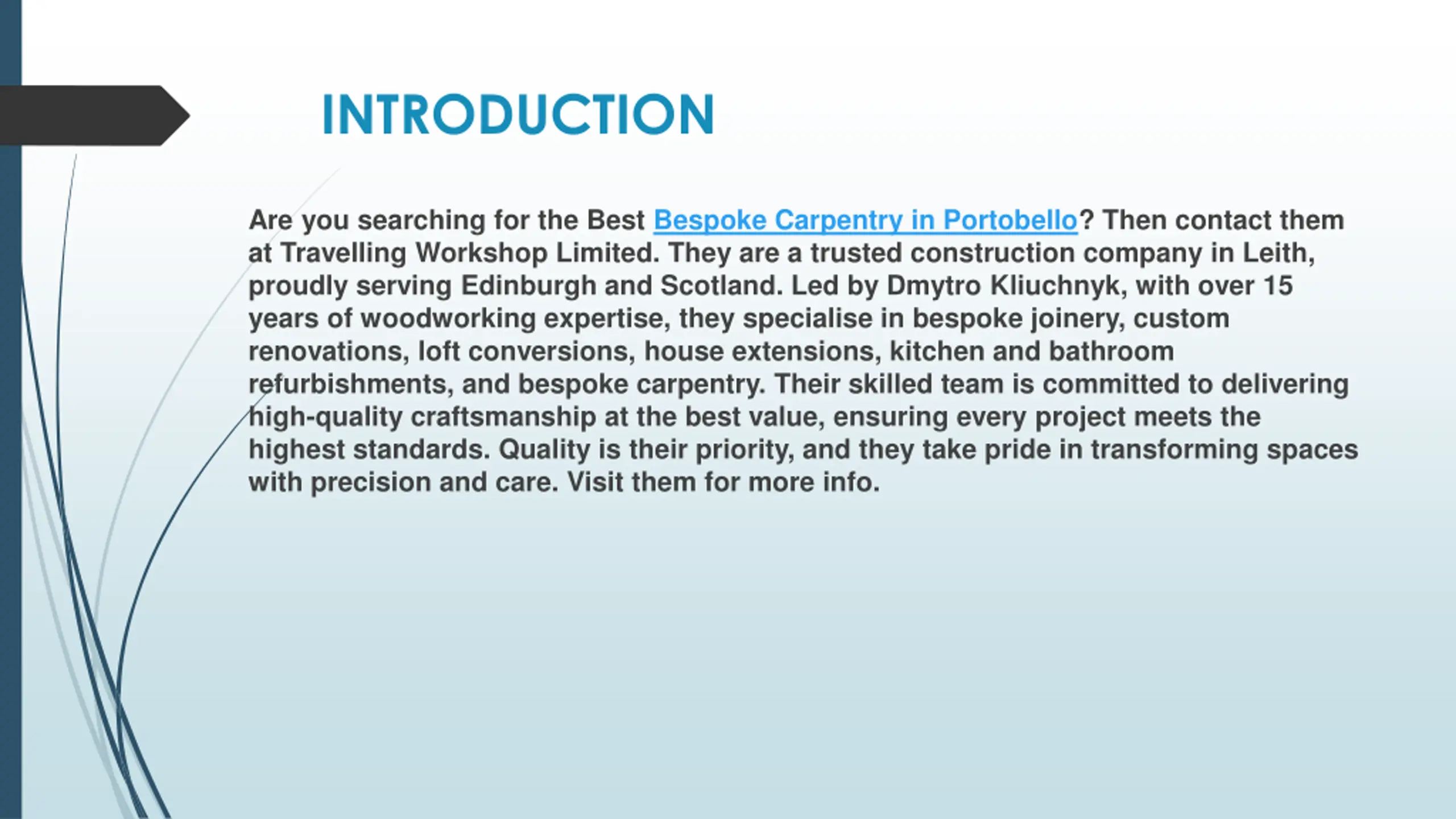 INTRODUCTION Are you searching for the Best Bespoke Carpentry in Portobello? Then contact them at Travelling Workshop Limited. They are a trusted construction company in Leith, proudly serving Edinburgh and Scotland. Led by Dmytro Kliuchnyk, with over 15 years of woodworking expertise, they specialise in bespoke joinery, custom renovations, loft conversions, house extensions, kitchen and bathroom refurbishments, and bespoke carpentry. Their skilled team is committed to delivering high-quality craftsmanship at the best value, ensuring every project meets the highest standards. Quality is their priority, and they take pride in transforming spaces with precision and care. Visit them for more info.