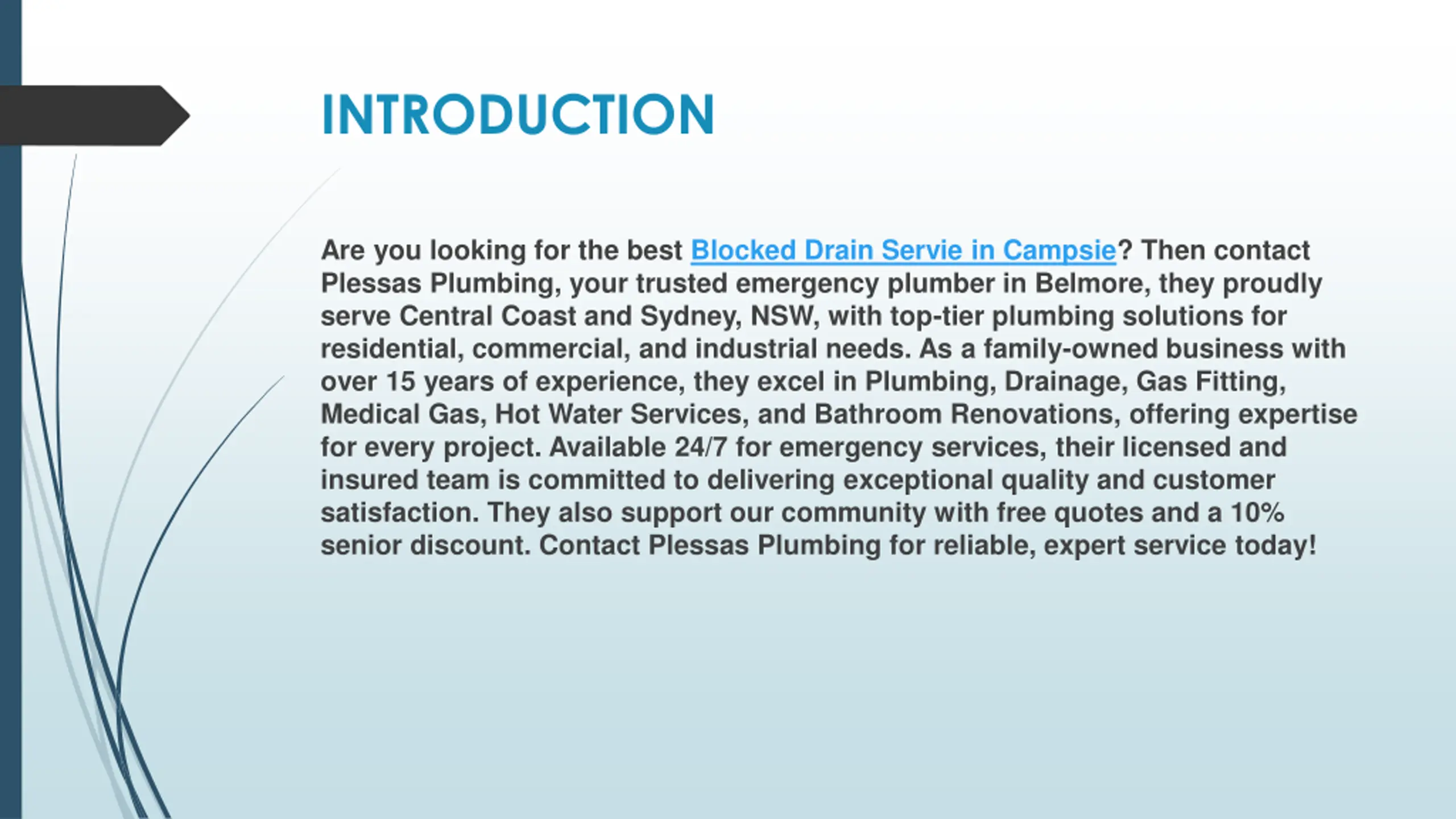 INTRODUCTION Are you looking for the best Blocked Drain Servie in Campsie? Then contact Plessas Plumbing, your trusted emergency plumber in Belmore, they proudly serve Central Coast and Sydney, NSW, with top-tier plumbing solutions for residential, commercial, and industrial needs. As a family-owned business with over 15 years of experience, they excel in Plumbing, Drainage, Gas Fitting, Medical Gas, Hot Water Services, and Bathroom Renovations, offering expertise for every project. Available 24/7 for emergency services, their licensed and insured team is committed to delivering exceptional quality and customer satisfaction. They also support our community with free quotes and a 10% senior discount. Contact Plessas Plumbing for reliable, expert service today!