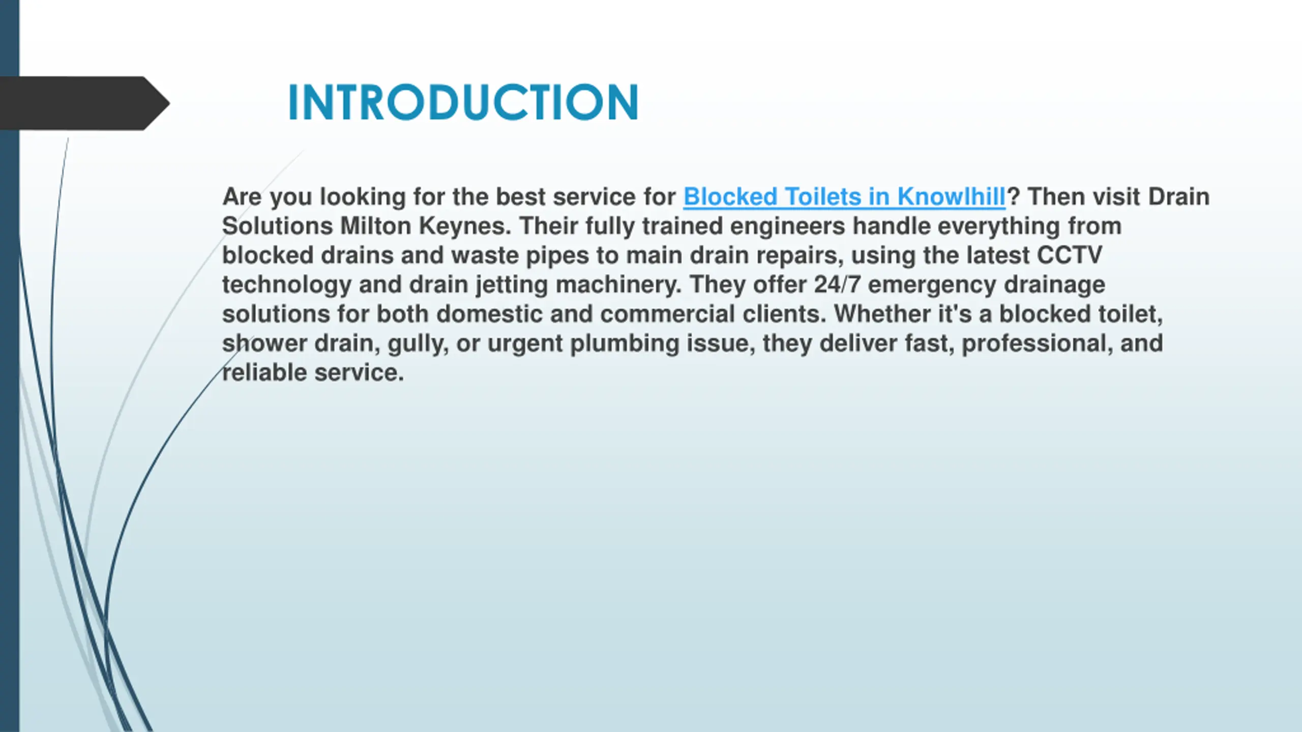 INTRODUCTION Are you looking for the best service for Blocked Toilets in Knowlhill? Then visit Drain Solutions Milton Keynes. Their fully trained engineers handle everything from blocked drains and waste pipes to main drain repairs, using the latest CCTV technology and drain jetting machinery. They offer 24/7 emergency drainage solutions for both domestic and commercial clients. Whether it's a blocked toilet, shower drain, gully, or urgent plumbing issue, they deliver fast, professional, and reliable service.
